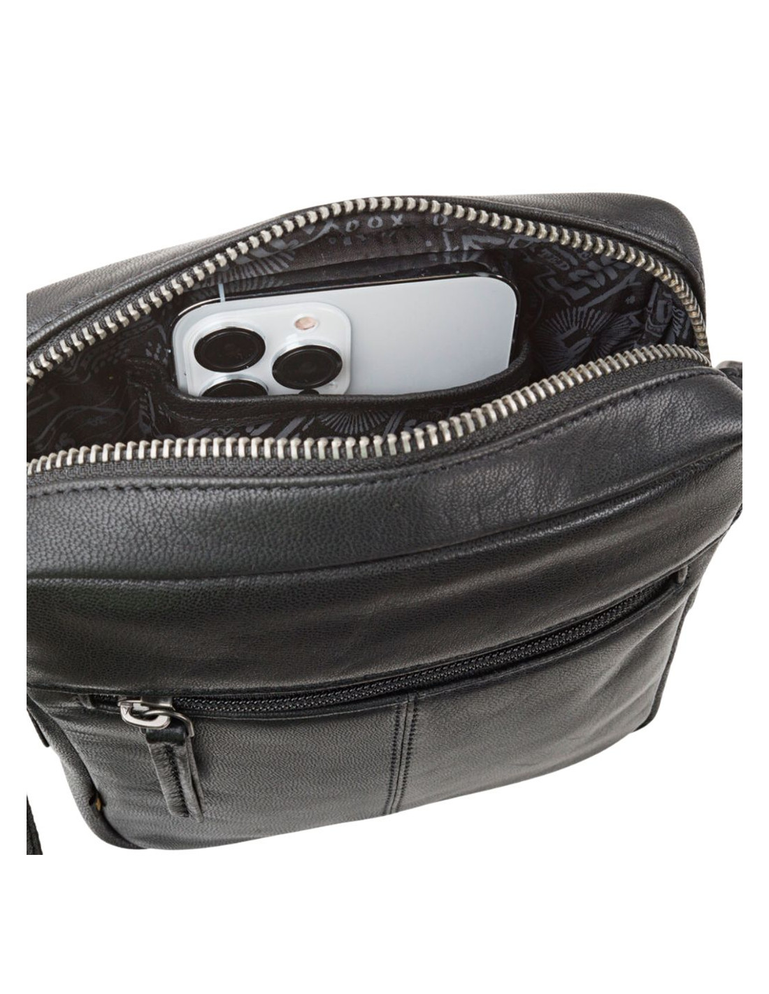 Cierre con cremallera. Bolsillos delante y detrás con cremallera. Base reforzada. Interior: Forro interior estampado. Organizador para móvil y llaves. Compartimento interior con cremallera.
