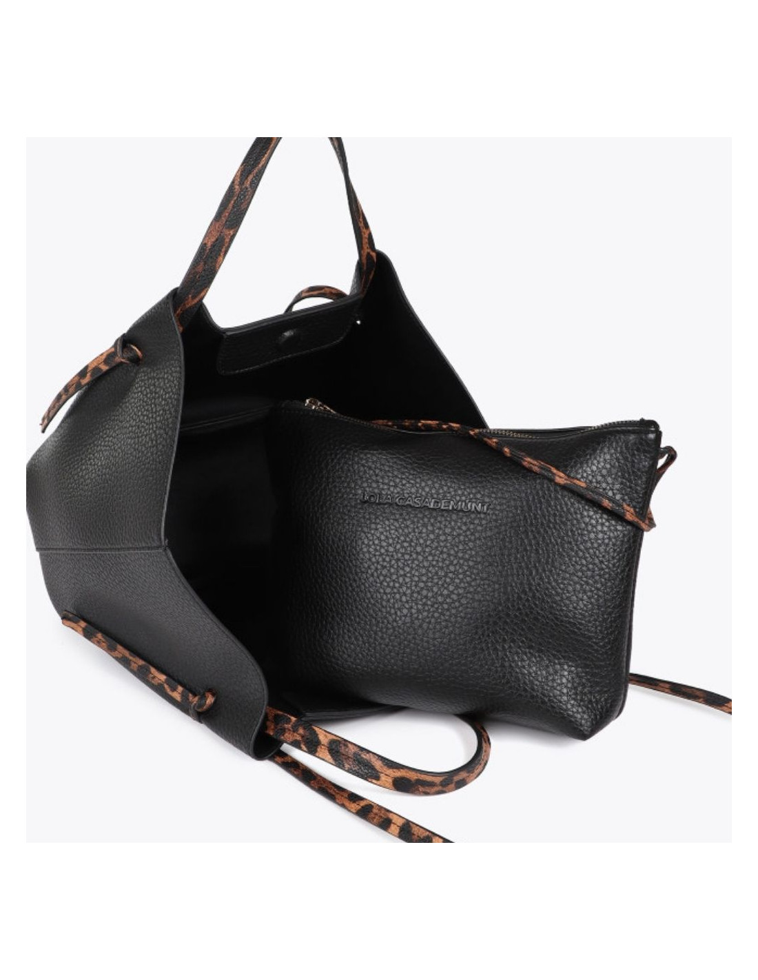 Bolso mini shopper confeccionado en material sintético con efecto piel y detalles de animal print. Compartimento interior con cremallera y cierre magnético. Correas ajustables para mayor comodidad.