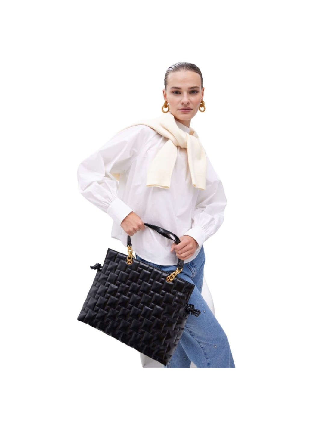 Shopper elegante con diseño acolchado y asas combinadas de cadena y efecto piel. Cuenta con amplio espacio interior, cierre magnético y acabado moderno. Ideal para complementar cualquier look diario o de oficina.