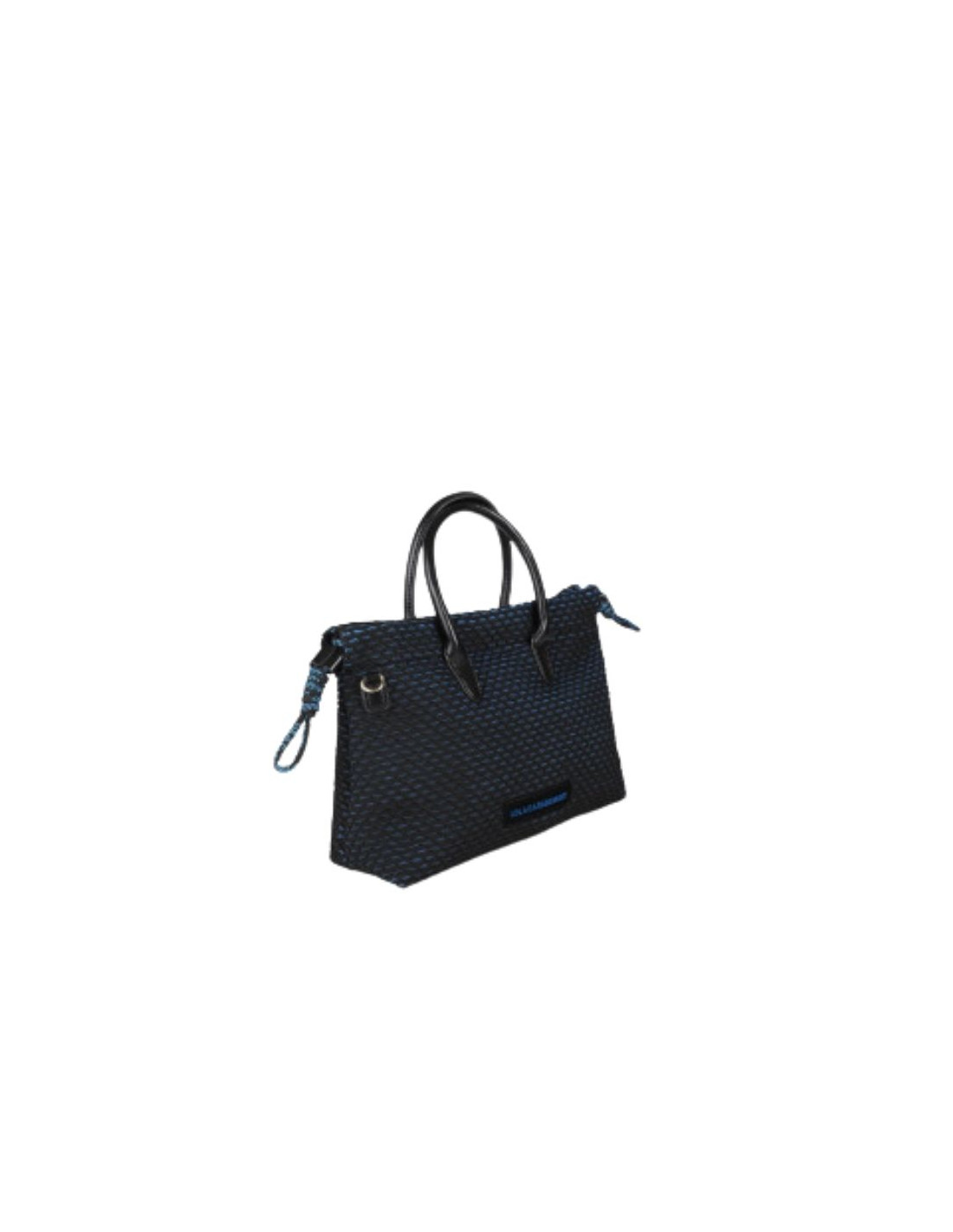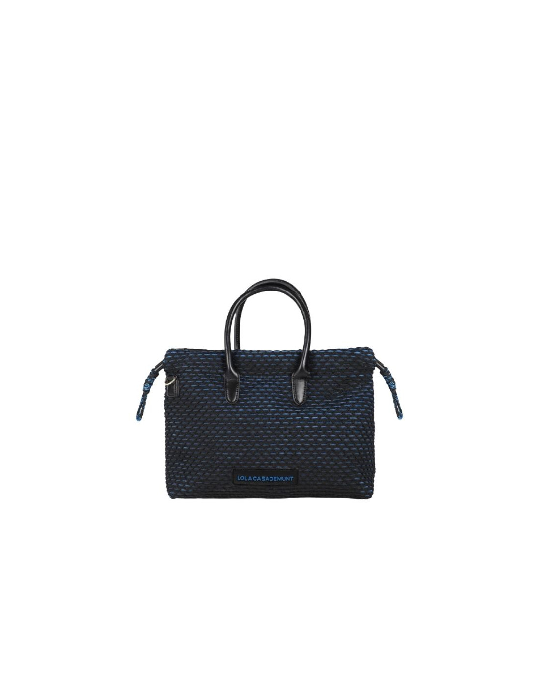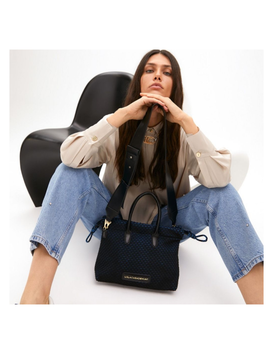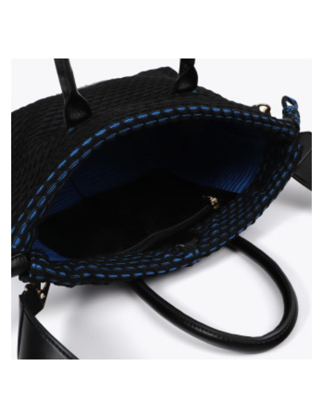 Bandolera en tejido de rejilla con interior azul. Diseño versátil con asa ajustable y detalles en negro. Espaciosa y liviana, perfecta para el día a día.