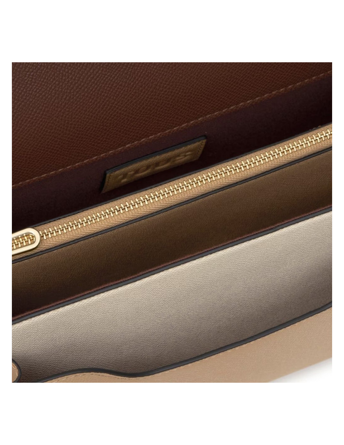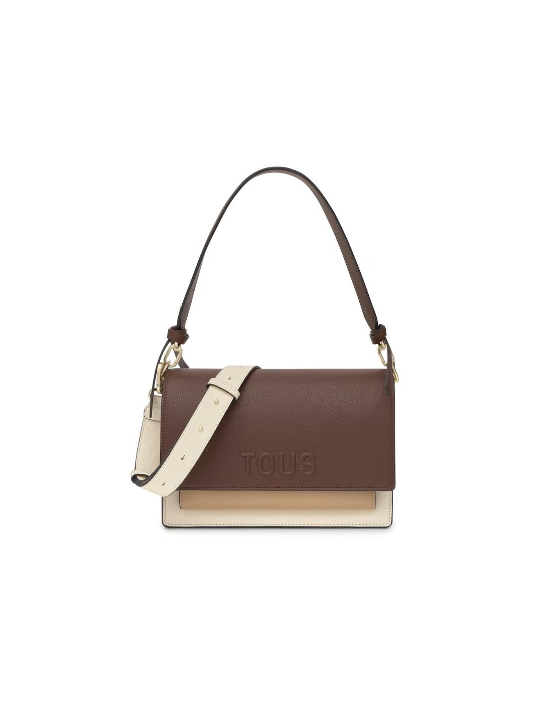 Bolso bandolera mediano Audree Saffiano de poliuretano en color beige y marrón. Cierre de solapa con botones magnéticos. Bolsillo exterior abierto. Tiene dos compartimentos separados por uno con cremallera. Asa bandolera ajustable y desmontable y asa de hombro desmontable. Medidas (alto x ancho x fondo): 17 x 25 x 12 cm.