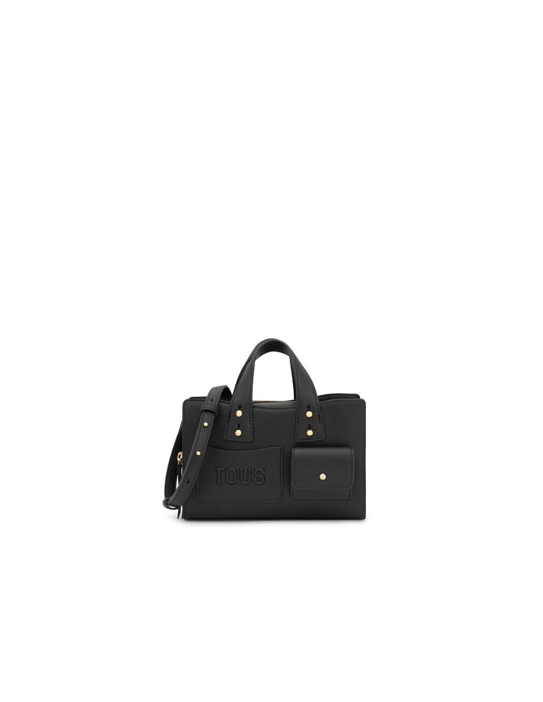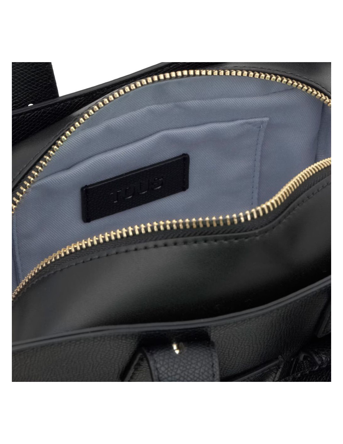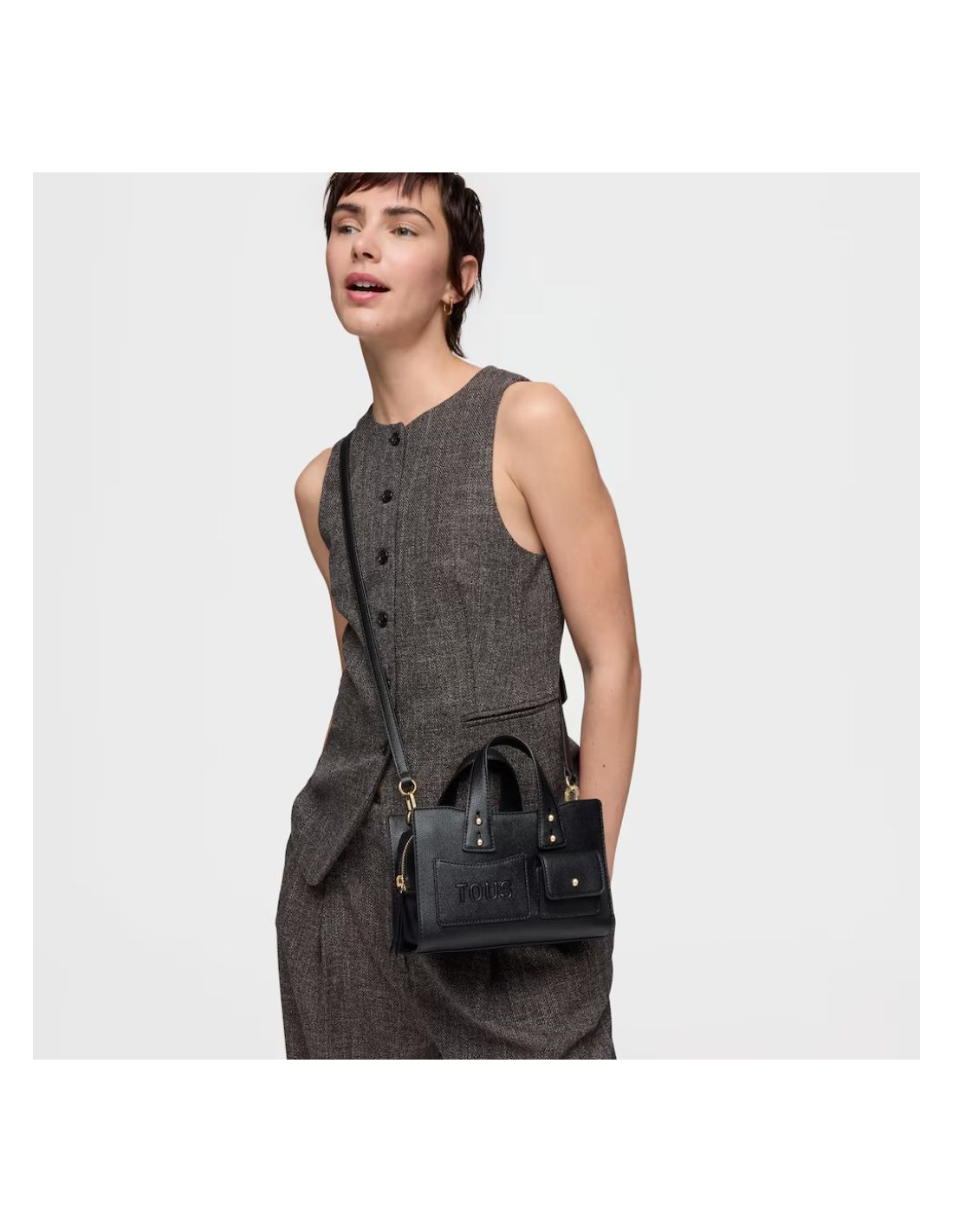 Bolso bowling pequeño TOUS Back to basica de poliuretano en color negro. Cierre de cremallera. Bolsillo interior abierto. Dos bolsillos exteriores. Asas fijas de hombro y asa bandolera ajustable y extraíble. Medidas (alto x ancho x fondo): 14,4 x 22 x 9 cm.