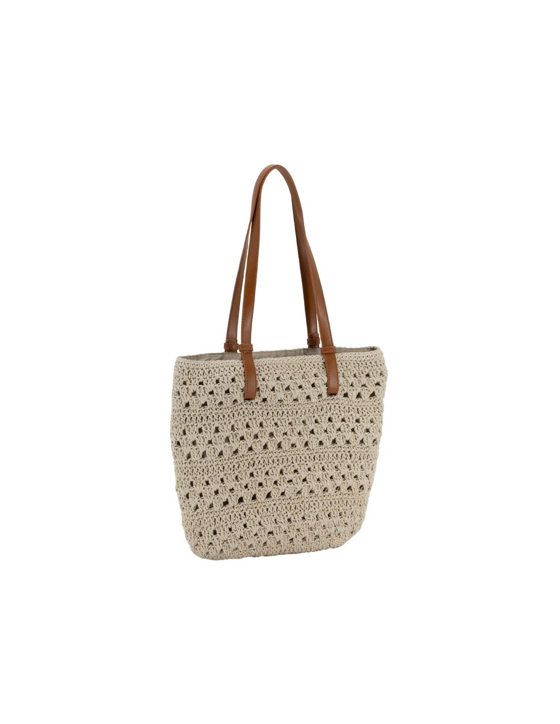 Este bolso tipo tote destaca por su estilo natural y artesanal, confeccionado en ganchillo con un entramado calado que aporta ligereza y un aire veraniego muy actual. Su tono beige neutro lo convierte en un complemento versátil y fácil de combinar con looks casuales y relajados.