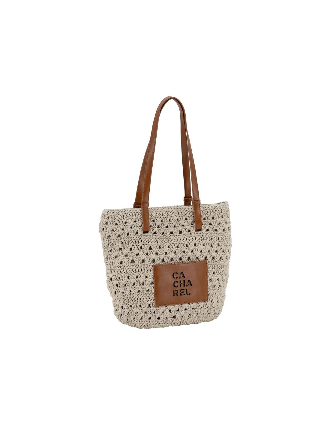 Incorpora asas largas en acabado color cuero, resistentes y cómodas para llevar al hombro. En el frontal presenta un parche con el logotipo CACHAREL en el mismo tono cuero, que añade un contraste elegante y refuerza su identidad de marca.