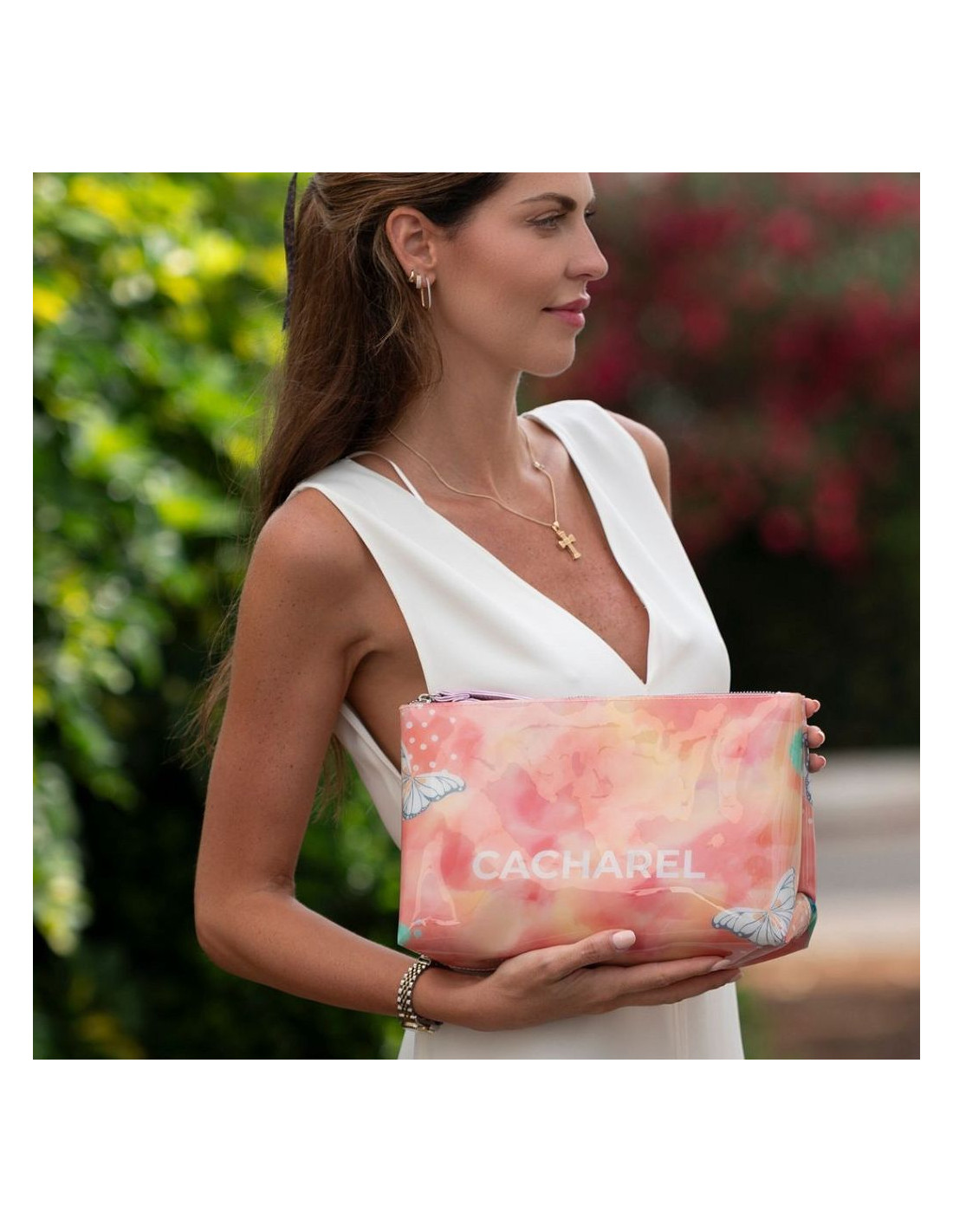 Cuenta con cierre de cremallera recta en la parte superior y una asa de mano a juego, perfecta para llevarlo cómodamente en la muñeca. El logotipo CACHAREL aparece centrado en el frontal, aportando un acabado elegante y reconocible.