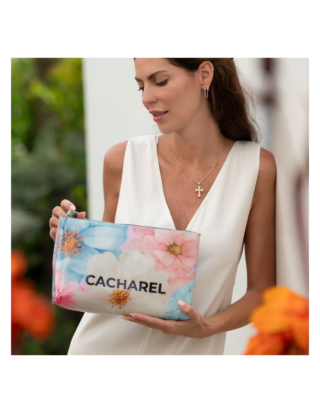 Incorpora cierre de cremallera recta en la parte superior y una asa de mano a juego en tono verde agua, ideal para llevarlo cómodamente en la muñeca. El logotipo CACHAREL aparece centrado en el frontal, aportando un toque moderno y distintivo.