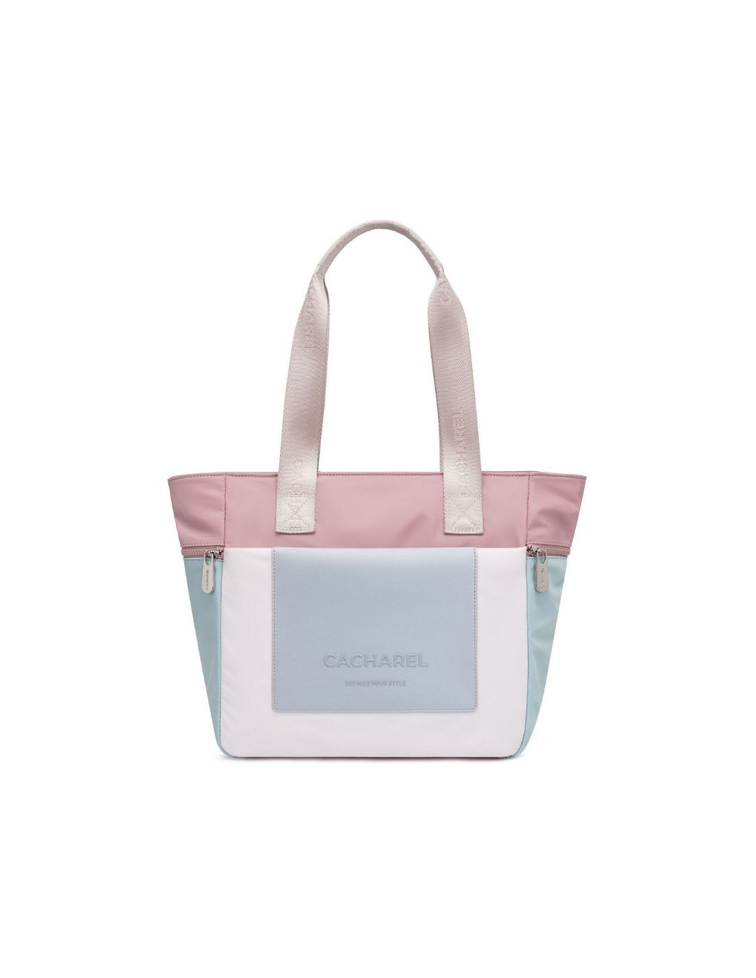 Bolso tipo tote confeccionado en nylon, un material muy ligero y resistente, ideal para el uso diario. Su diseño combina bloques de color suaves y actuales, aportando un estilo moderno y versátil.