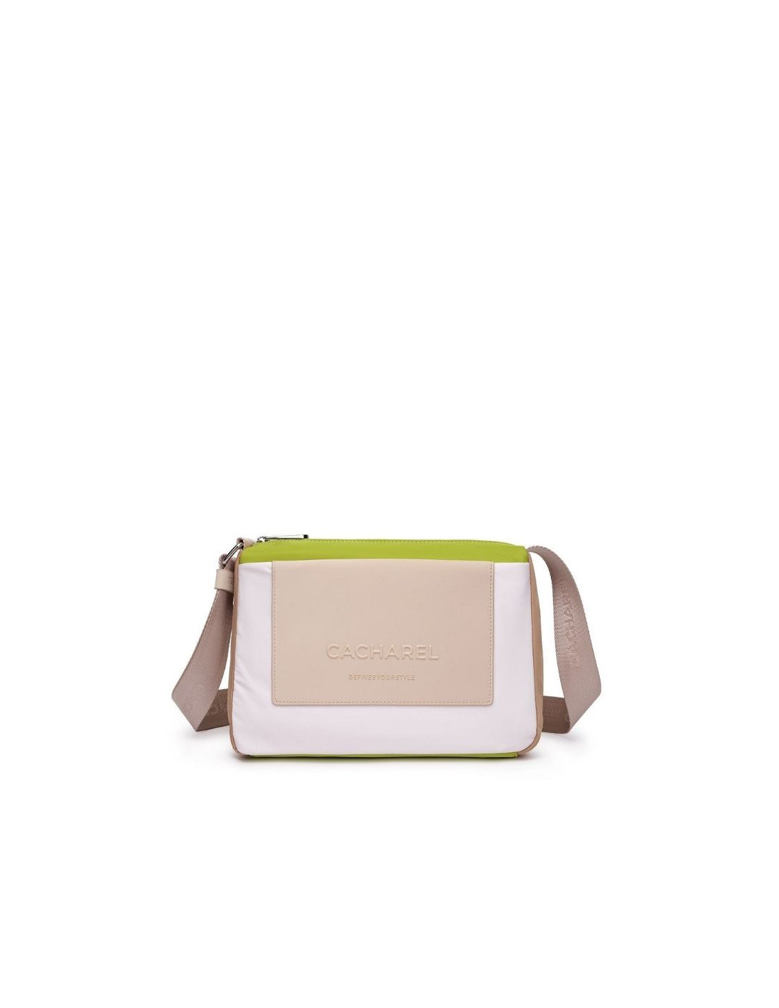 Es un bolso de diseño moderno y funcional, confeccionado en nylon, lo que lo hace muy ligero y cómodo para el uso diario. Presenta un atractivo diseño en bloques de color con tonos suaves y actuales, que le dan un aire fresco y urbano.