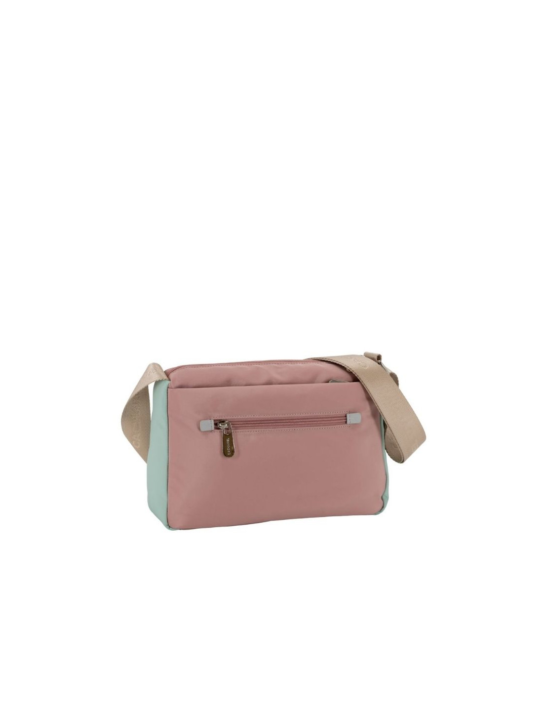 Es un bolso de diseño moderno y funcional, confeccionado en nylon, lo que lo hace muy ligero y cómodo para el uso diario. Presenta un atractivo diseño en bloques de color con tonos suaves y actuales, que le dan un aire fresco y urbano.
