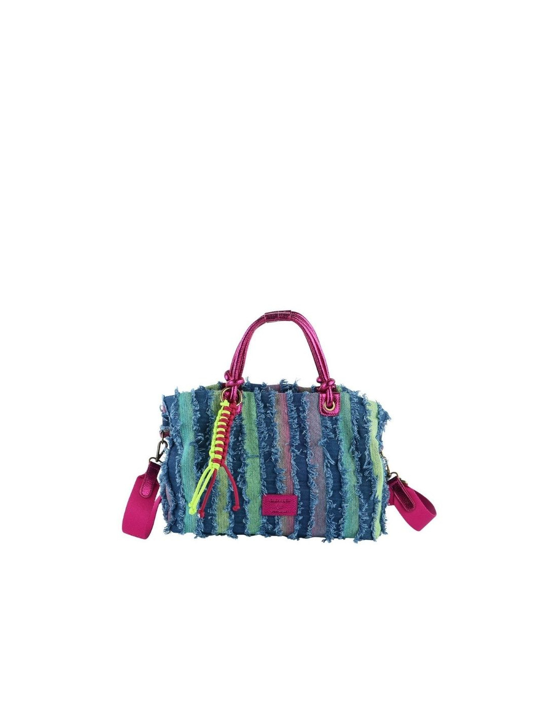Está confeccionado en material vaquero con un trabajo de franjas verticales en distintos tonos, que aportan profundidad y un aire artesanal al diseño. El acabado desflecado refuerza su carácter casual y moderno.