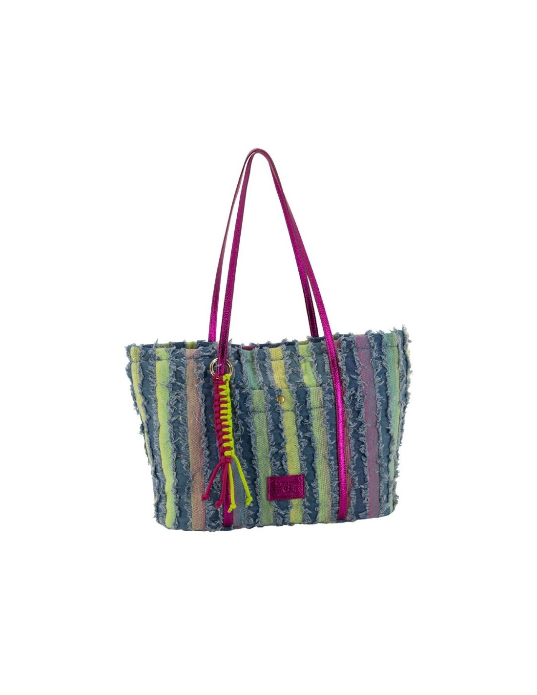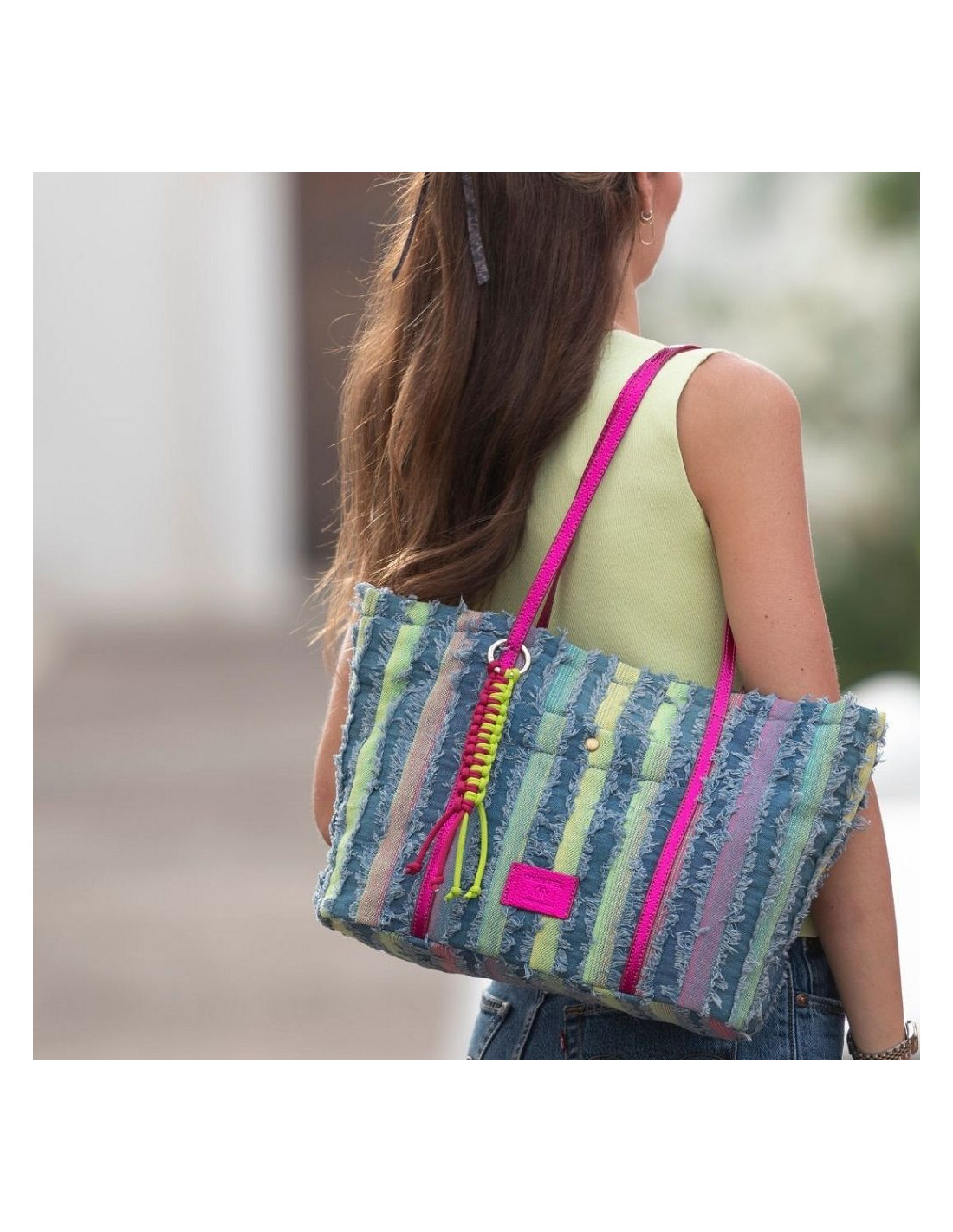 Cuenta con asas largas metalizadas en color fucsia, ideales para llevar cómodamente al hombro y que aportan un contraste vibrante frente al tejido denim. Incorpora un detalle trenzado decorativo en tonos flúor y una placa frontal con el logo, que añade identidad y un toque distintivo.