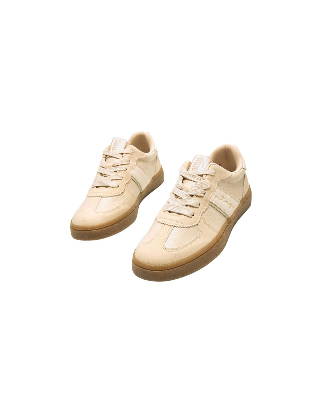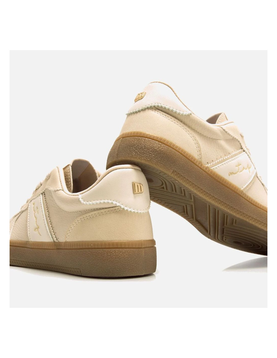 Zapatilla de color arena para mujer de la marca Mustang modelo Roy, estilo retro. Este diseño urbano destaca por su combinación de materiales con acabado en piel y detalles cosidos en los paneles laterales. Su suela de color caramelo y la firma bordada en el lateral aportan un toque distintivo y actual. Perfectas para el día a día, estas zapatillas se adaptan fácilmente a distintos looks casuales gracias a su versatilidad y comodidad. Un modelo clásico con esencia deportiva que nunca pasa de moda.