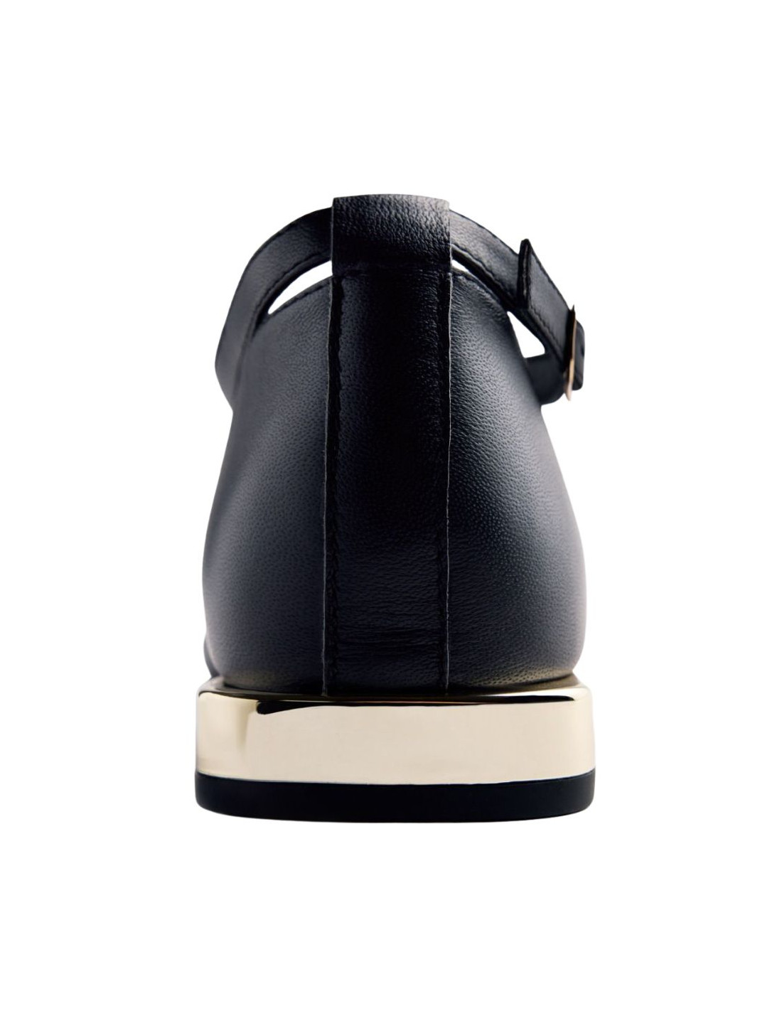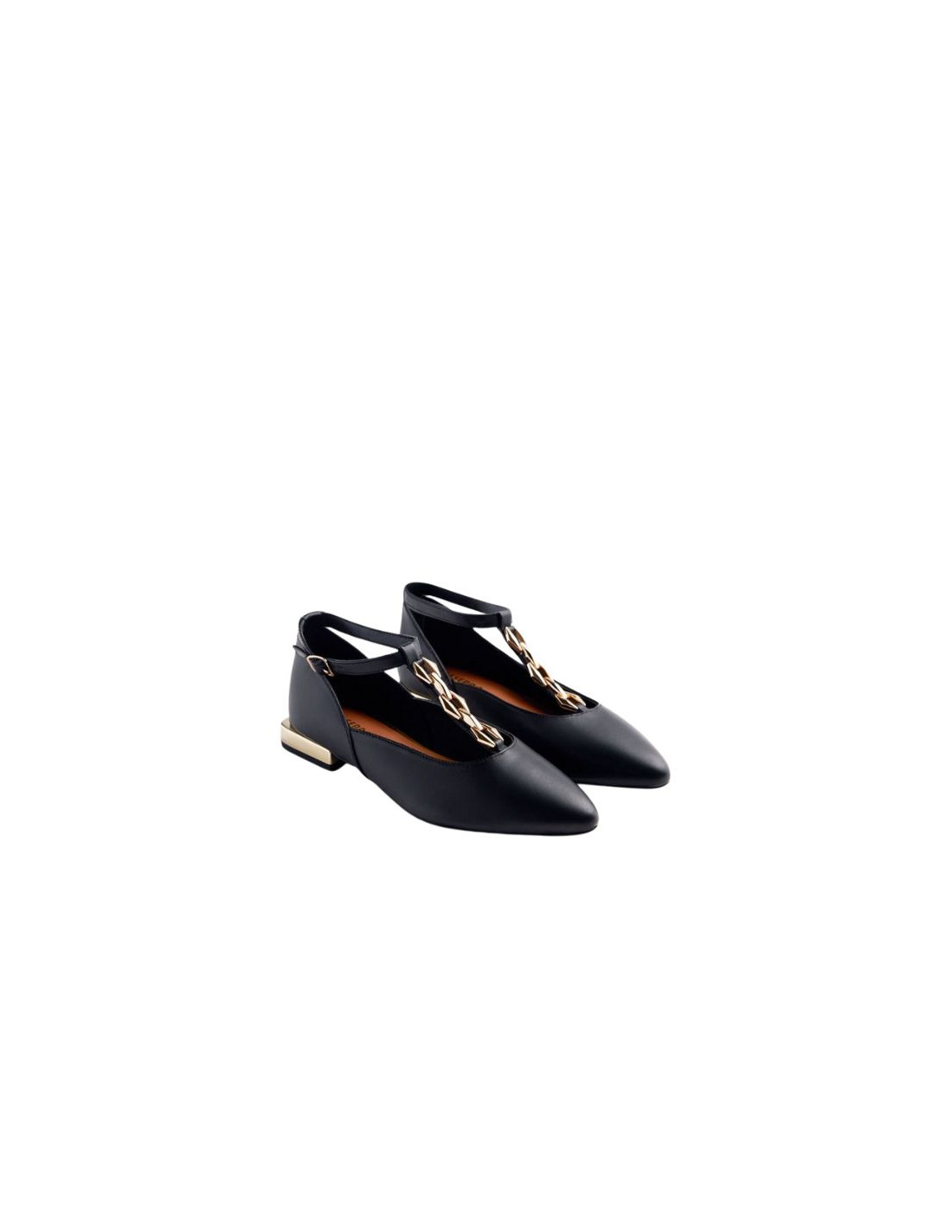 Bailarinas de piel con cadena en acabado dorado y tacón metalizado. Punta afilada. Cuentan con planta acolchada, tira tipo T y cierres ajustables tipo pulsera. Altura tacón: 1,5 cm.