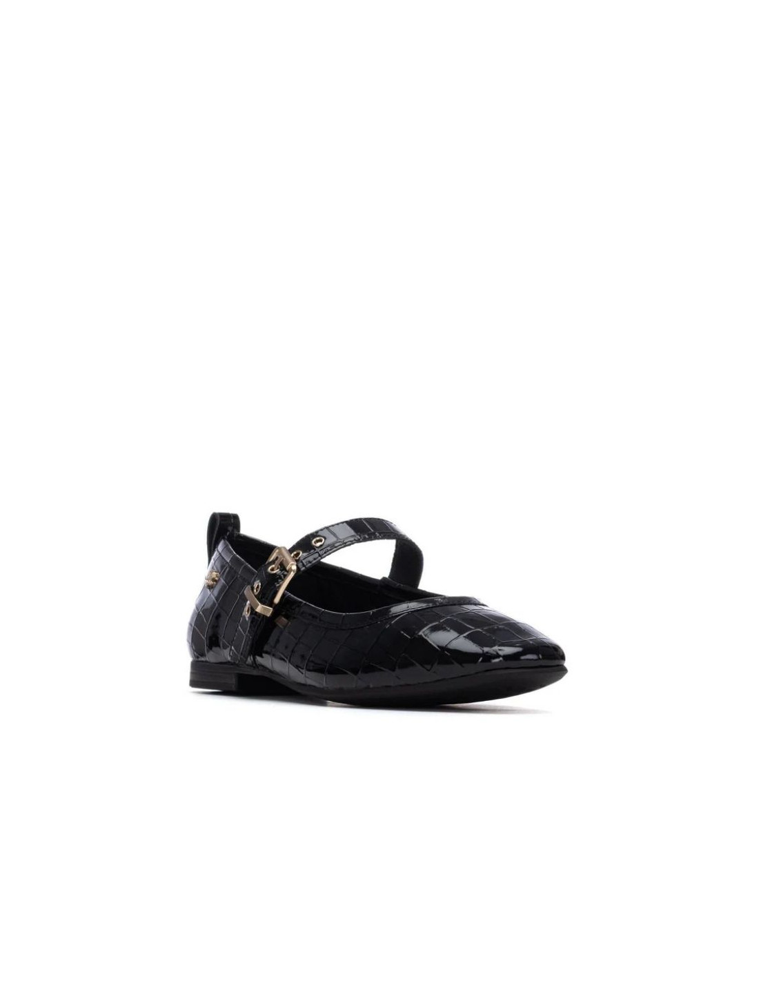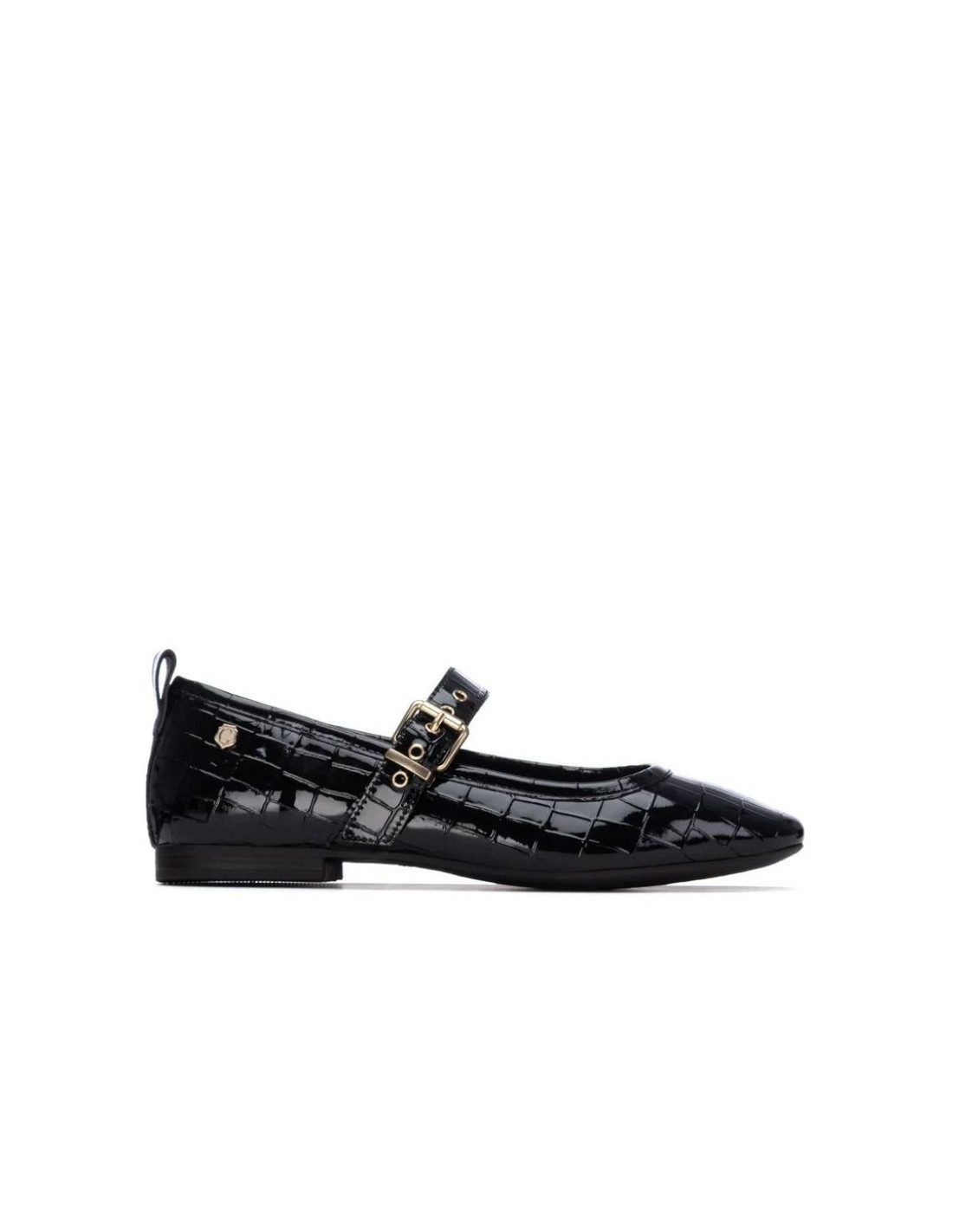 Zapato de mujer, de la marca Carmela. Fabricado en charol. Estilo bailarina con cierre mediante hebilla. Cómoda suela plana, antideslizante. Plantilla extraíble