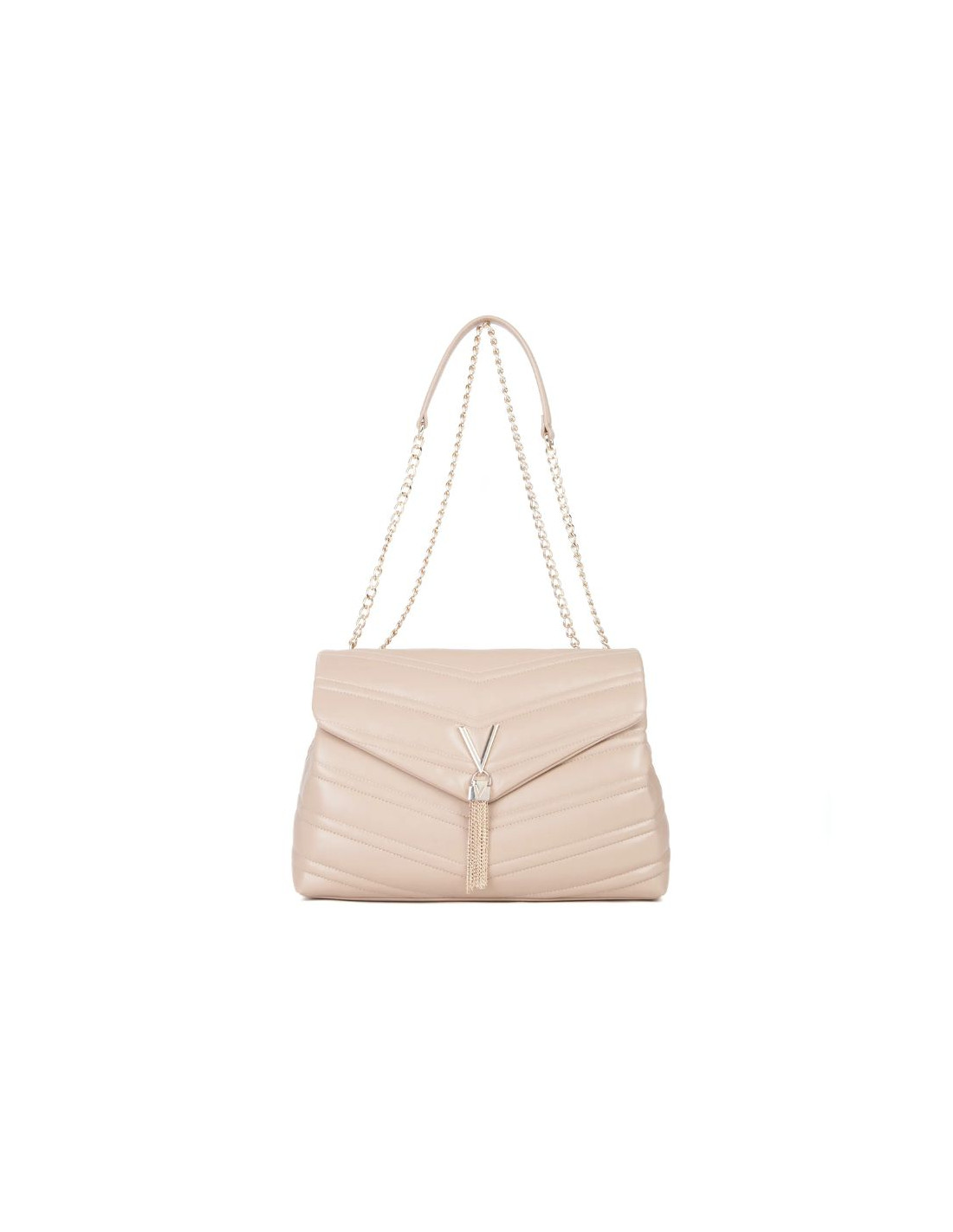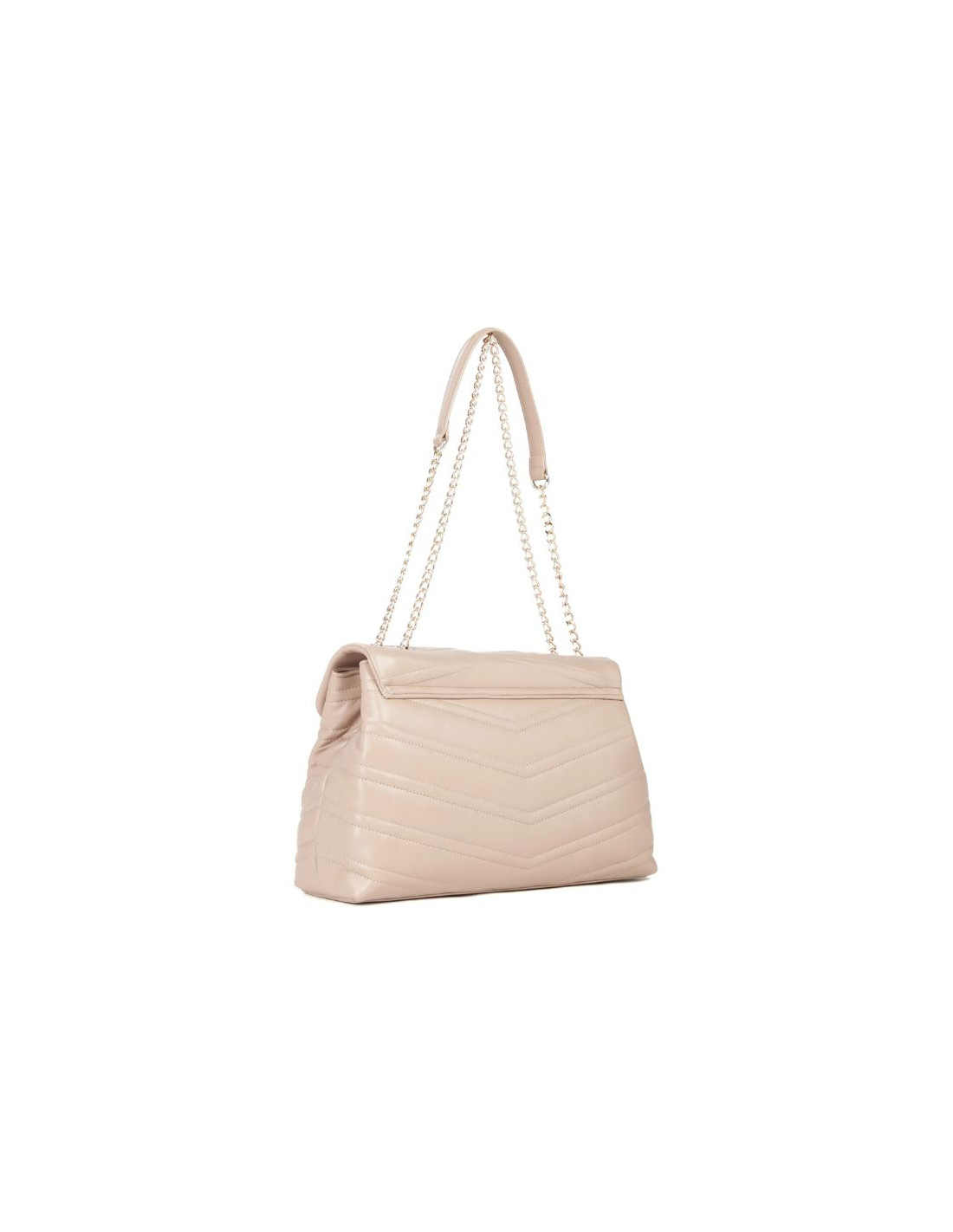 Bolso de tamaño mediano, de napa con acabado matelassé beige. El logo está presente en la parte delantera y está equipado con una bandolera de cadena.