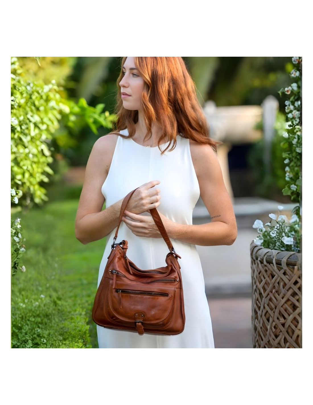 Shopper mediano de piel vacuna y lavada. Cierre con cremallera, asa de hombro, varios bolsillos en el exterior en la parte delantera y trasera. Varios bolsillos internos