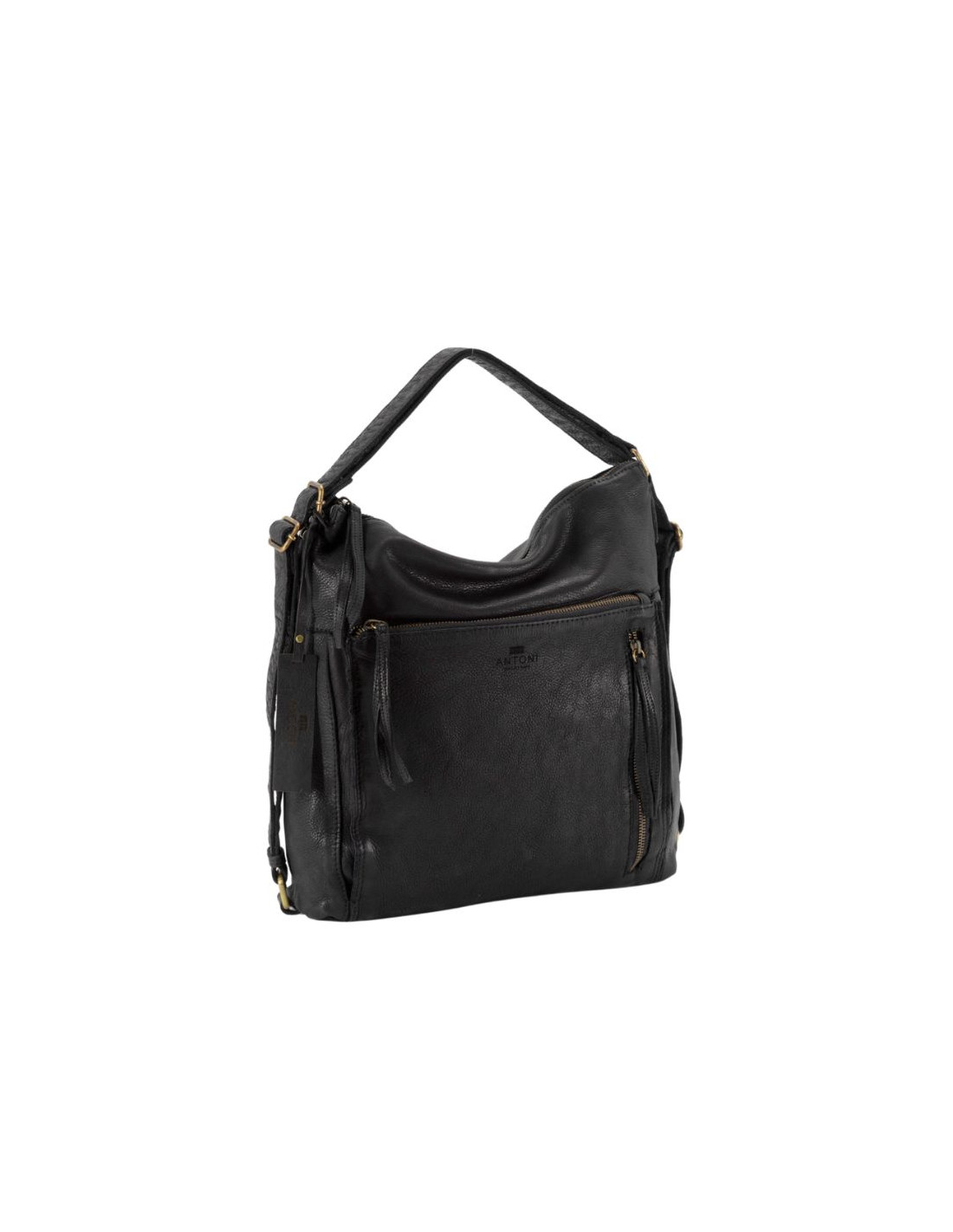 Bolso mochila de piel vacuna y lavada. Cierre con cremallera, asa de hombro se puede convertir en mochila. Varios bolsillos en el exterior en la parte delantera y trasera. Varios bolsillos internos.