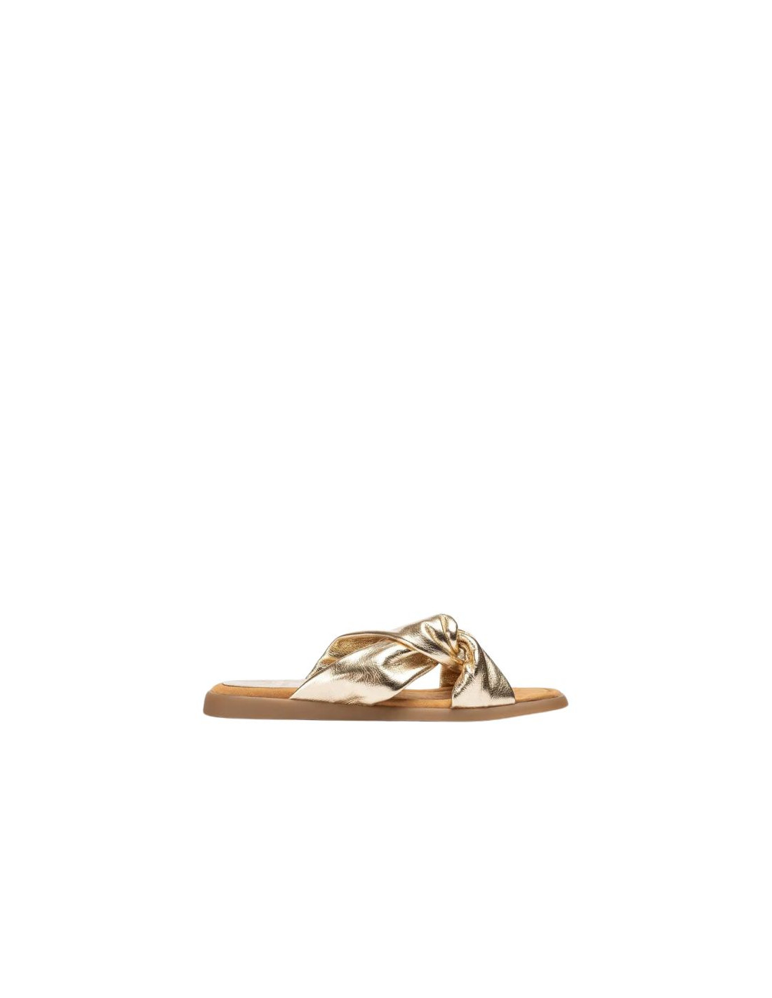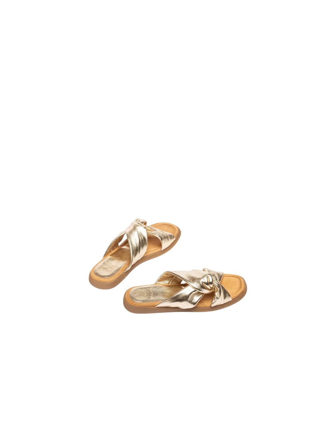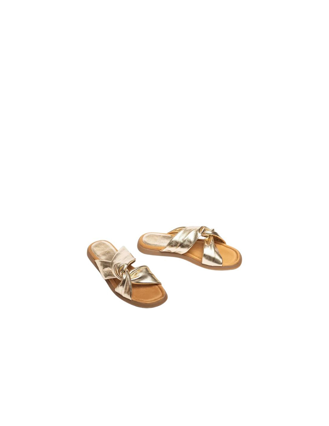 Sandalia plana de punta cuadrada fabricada en piel metalizada. Tiras anchas cruzadas en el empeine. Suela de goma ligera, flexible y antideslizante. No vas a querer ponerte otra sandalia.