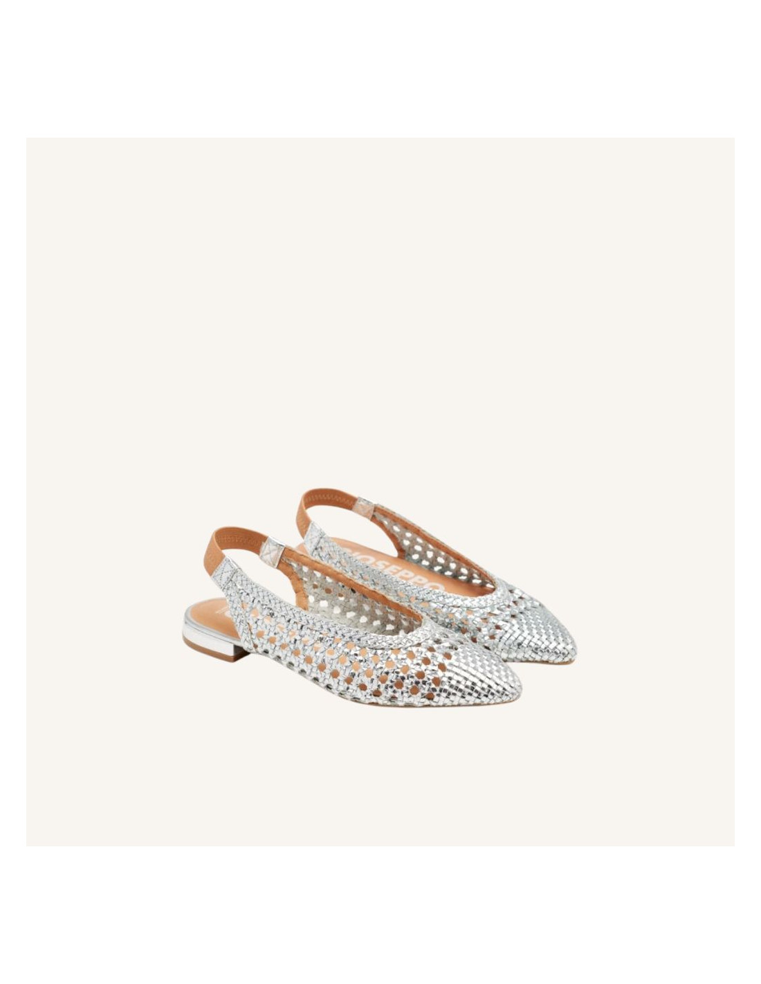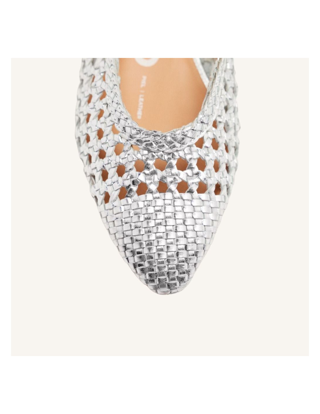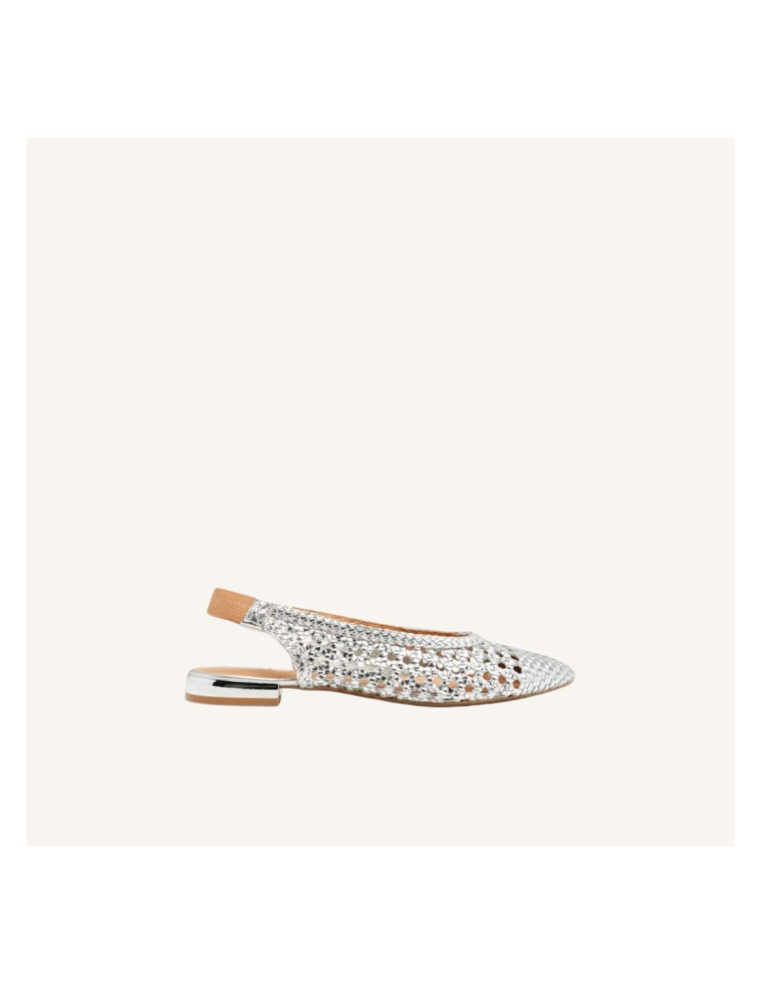 Bailarinas destalonadas color plata de piel con trenzados. Forro y planta de piel. Planta acolchada en látex de suave tacto, muy confortable. Tacón metalizado que le aporte un extra de estilo.