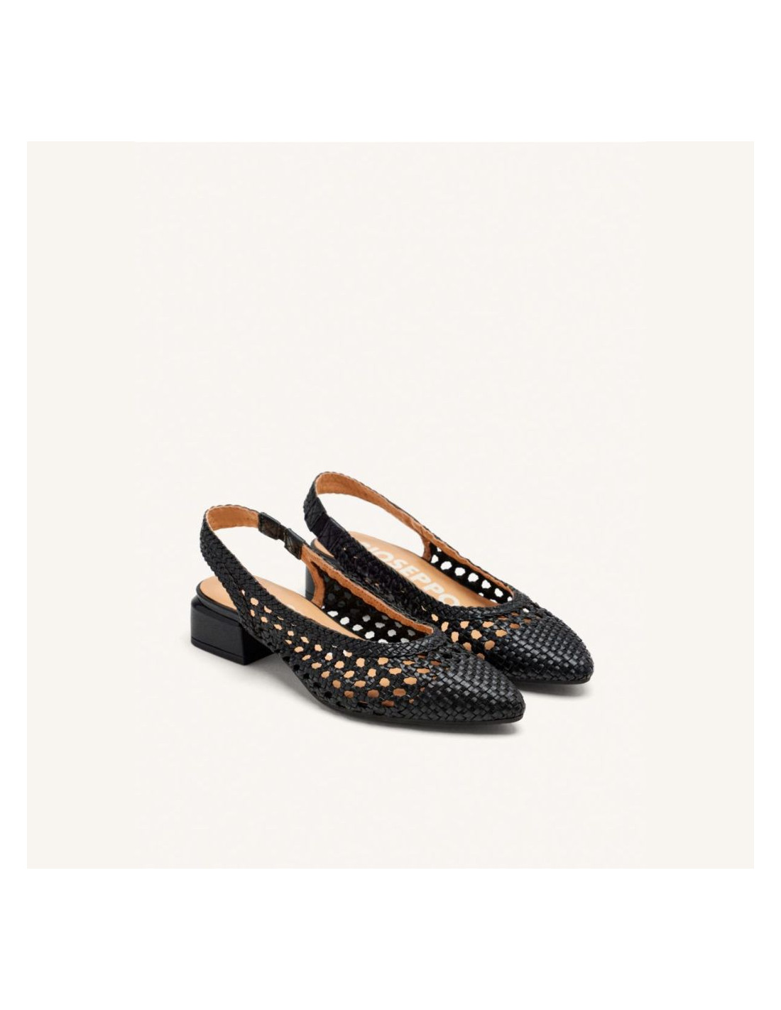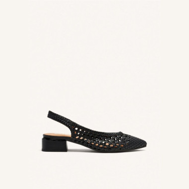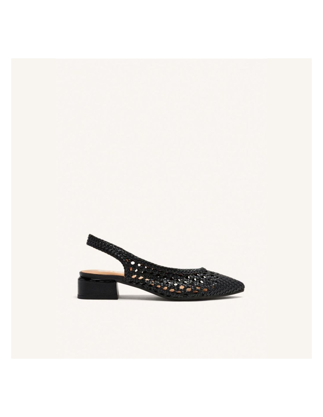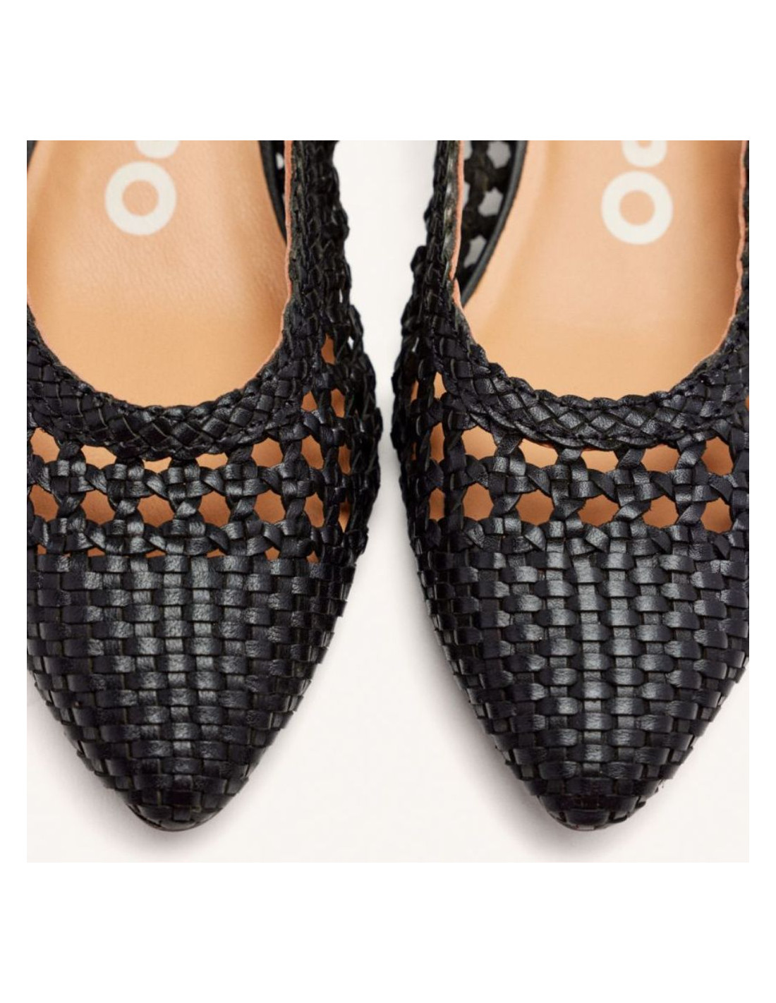 Bailarinas destalonadas color negro de piel con trenzados con tacón medio. Forro de piel. Planta muy confortable de piel curtida en un proceso de curtición más sostenible bajo los estándares de Leather Working Group