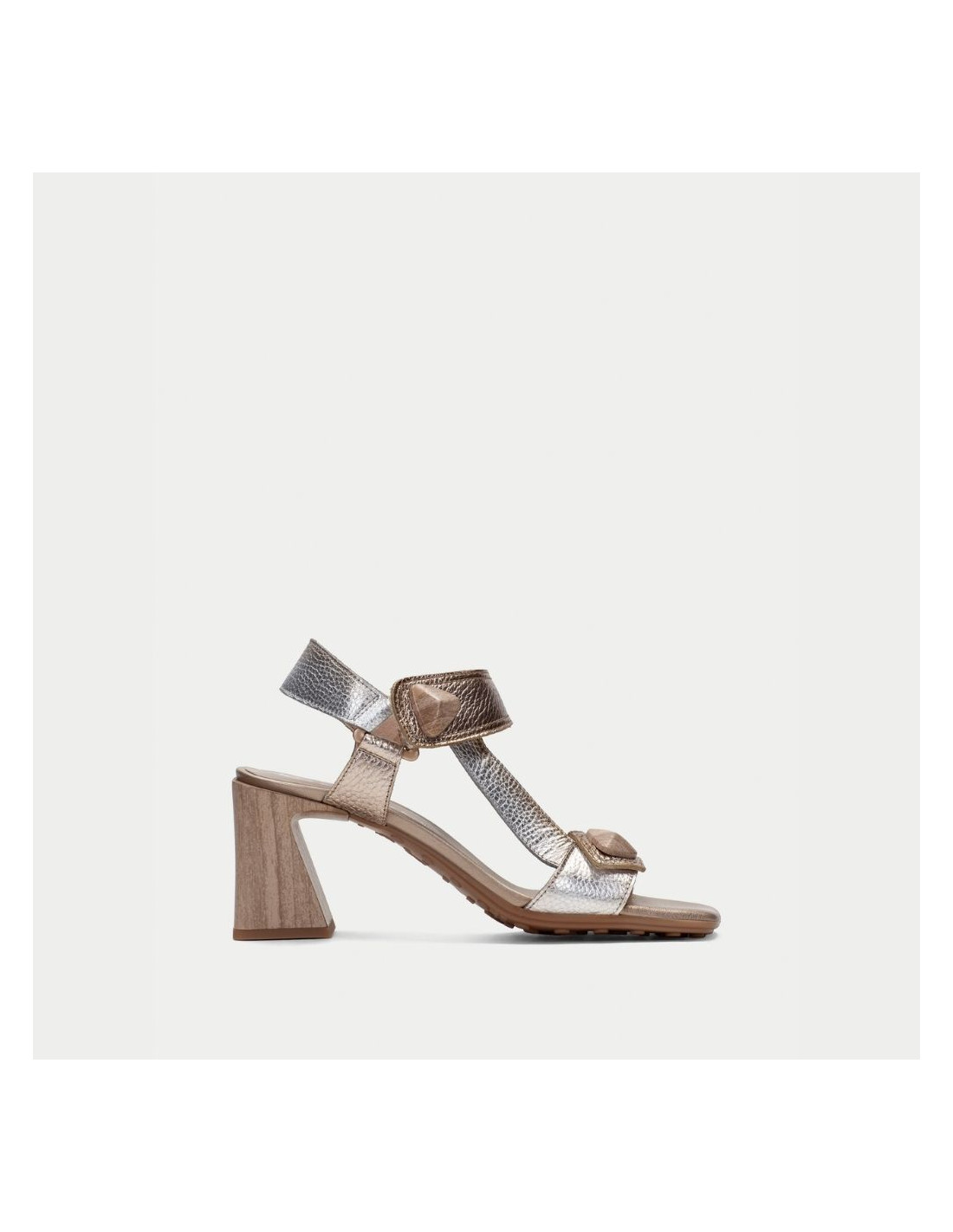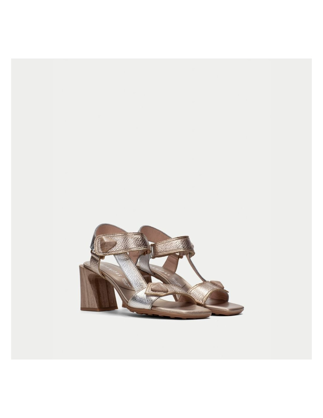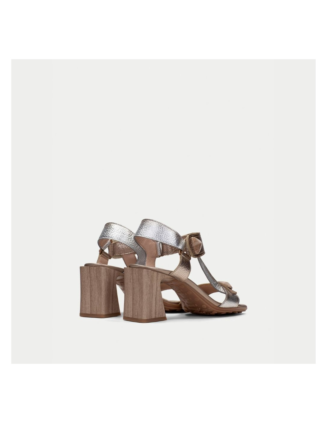 Sandalia con estructura de tiras en piel con detalles geométricos en el empeine y el tobillo.