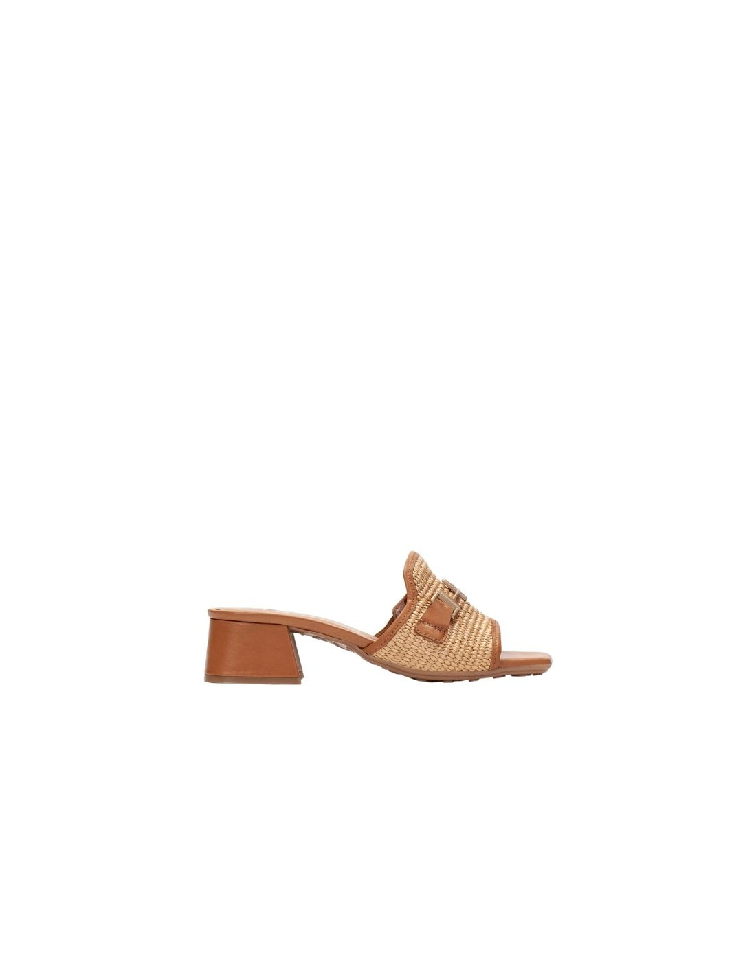 Fabricada en piel combinada con rafia trenzada.