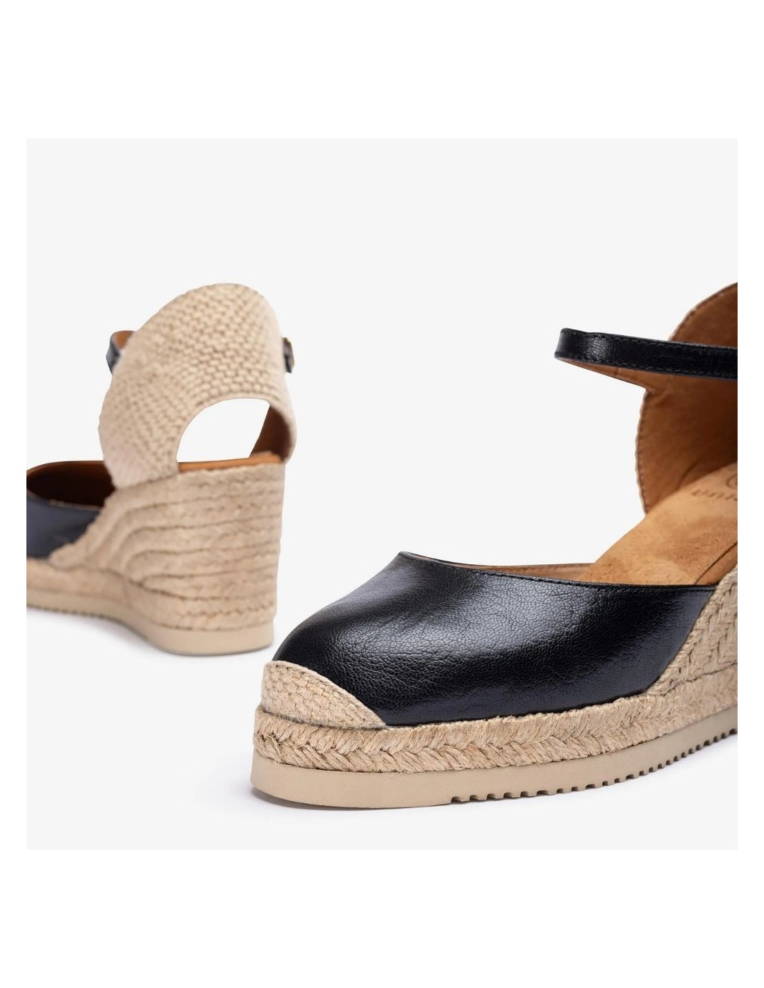 Alpargata para mujer de punta redonda fabricada en piel color negro. Talonera de rafia y ajustable con hebilla metálica. Plataforma de 1cm y cuña de 5cm forradas en yute. Suela de EVA más ligera y flexible que nunca gracias a la tecnología Superlight de Unisa.