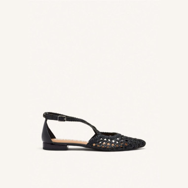 Bailarinas de piel color negro con punta fina, piel con trenzados y detalle de trenzas sobre el empeine. Cierre ajustable al tobillo para una mayor sujeción. Forro de piel. Plantilla acolchada muy confortable de piel curtida en un proceso de curtición más sostenible bajo los estándares de Leather Working Group.