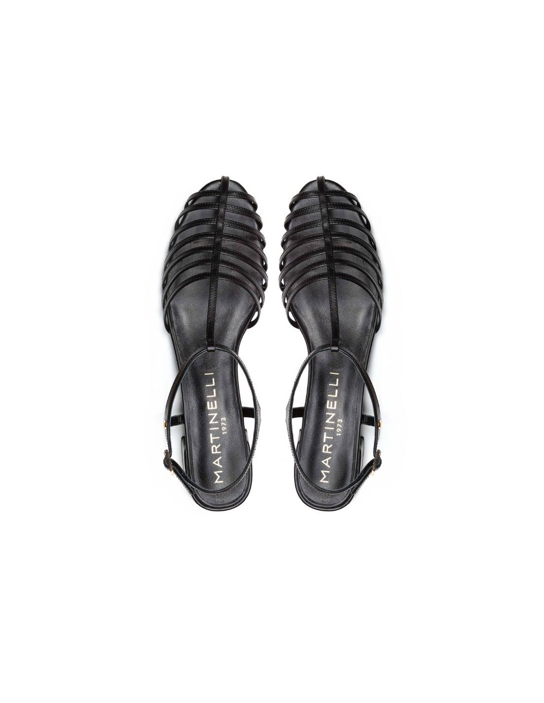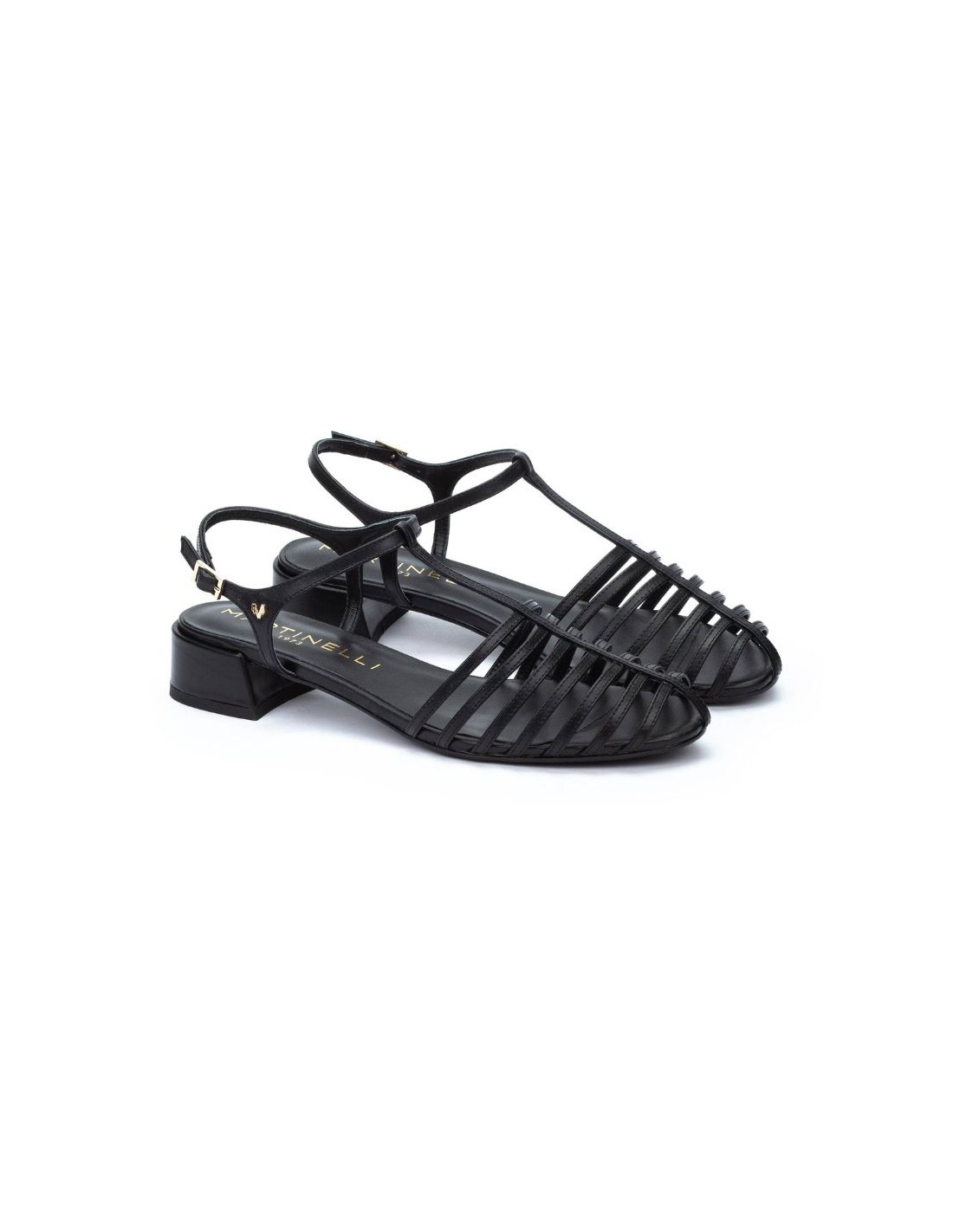Sandalias PANARO de Martinelli. Estas sandalias negras, con un diseño que combina la elegancia de una cangrejera fina en la punta con una estructura más abierta, ofrecen una sofisticación sutil. Con un tacón de 4 cm que proporciona un toque de elevación sin sacrificar la comodidad, están confeccionadas en piel de alta calidad para un ajuste impecable