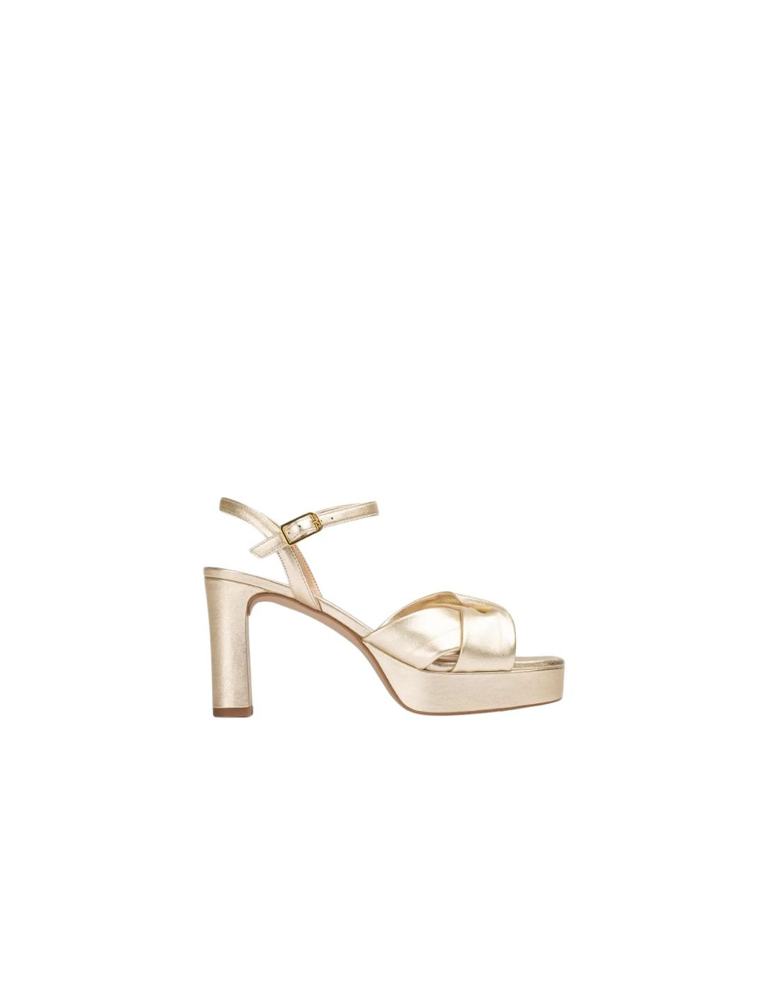 Sandalia de punta redonda fabricada en piel metalizada. Tiras anchas cruzadas en la parte delantera y pulsera en el tobillo ajustable con hebilla. Plataforma de 3cm y tacón de 8,5cm de altura forrados en piel metalizada al tono. Suela de goma ligera y antideslizante. La colección de verano de Unisa será tu mejor complemento.
