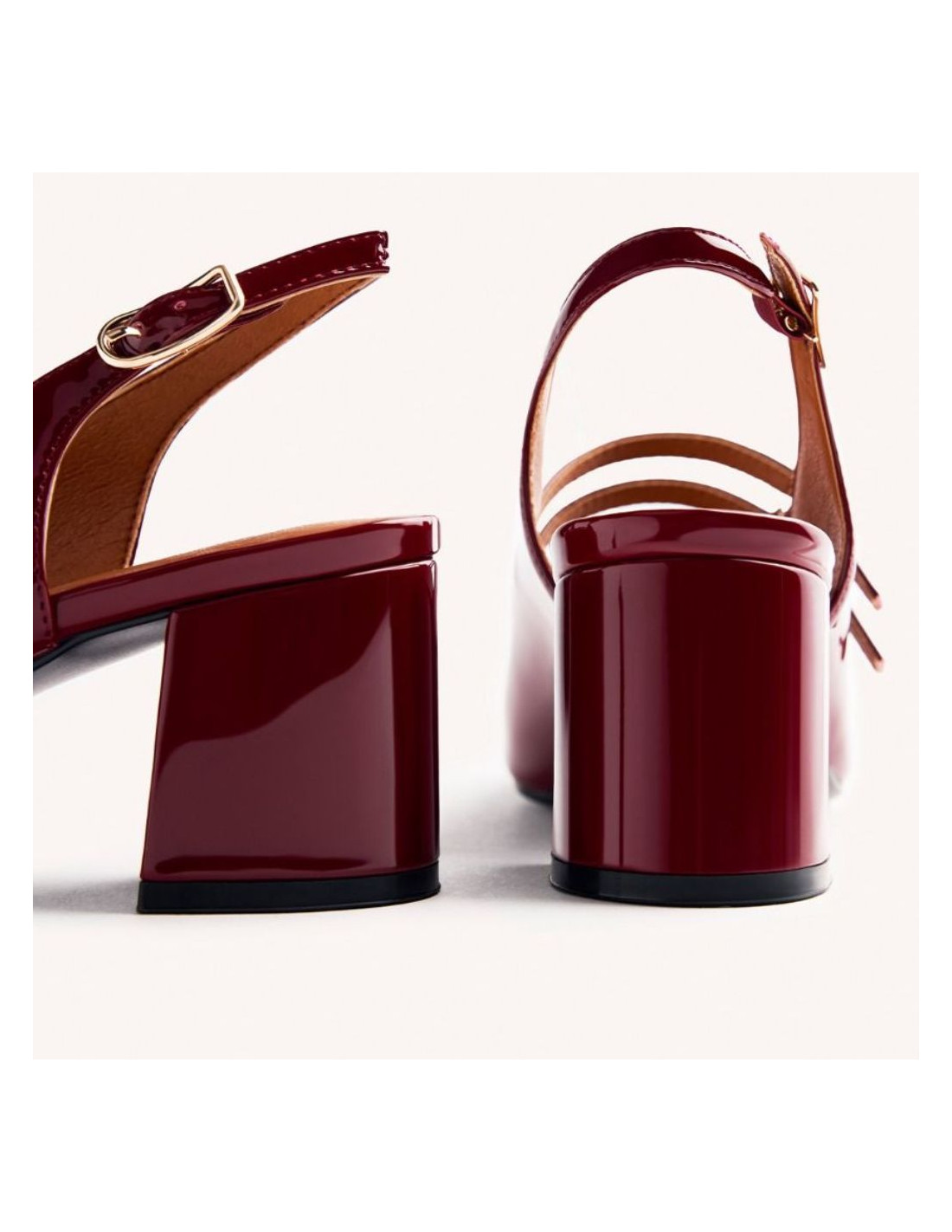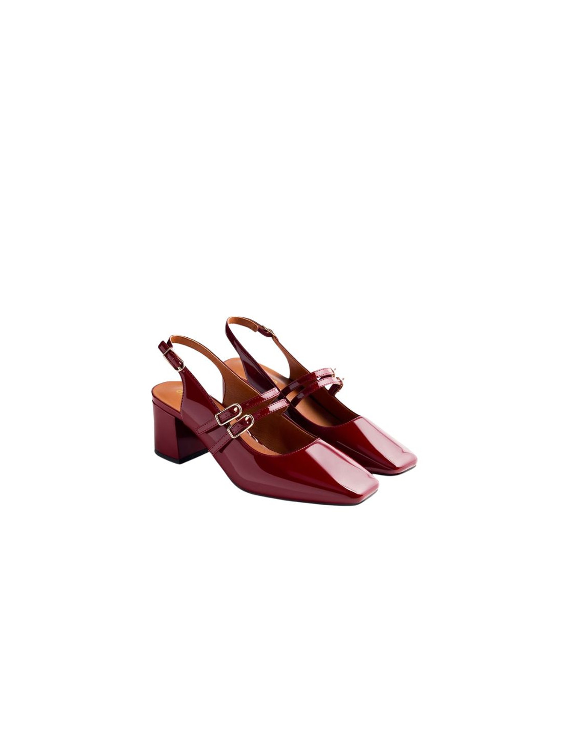 Zapatos estilo Mary-Jane destalonados con acabado en efecto charol. Punta cuadrada. Cuentan con planta acolchada, tacón tipo bloque y cierres ajustables en el empeine y en el talón. Altura tacón: 5,5 cm.