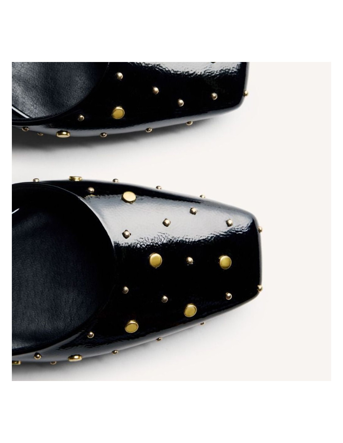 Zapatos estilo Mary-Jane con acabado en efecto charol y tachas doradas. Punta cuadrada. Cuentan con planta acolchada, tacón tipo bloque y cierres ajustables tipo pulsera. Altura tacón: 5,5 cm.