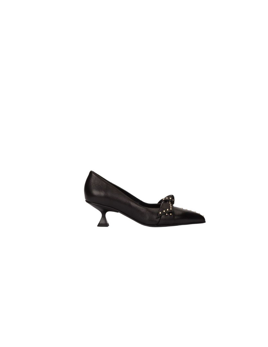 Zapatos de tacón de piel de color negro con adorno. La sofisticación y la elegancia se unen en este zapato de tacón. Su diseño resalta la delicadeza del cuero mate, ofreciendo un aspecto elegante y atemporal, que combina a la perfección con el detalle del lazo con tachas sobre el empeine.
