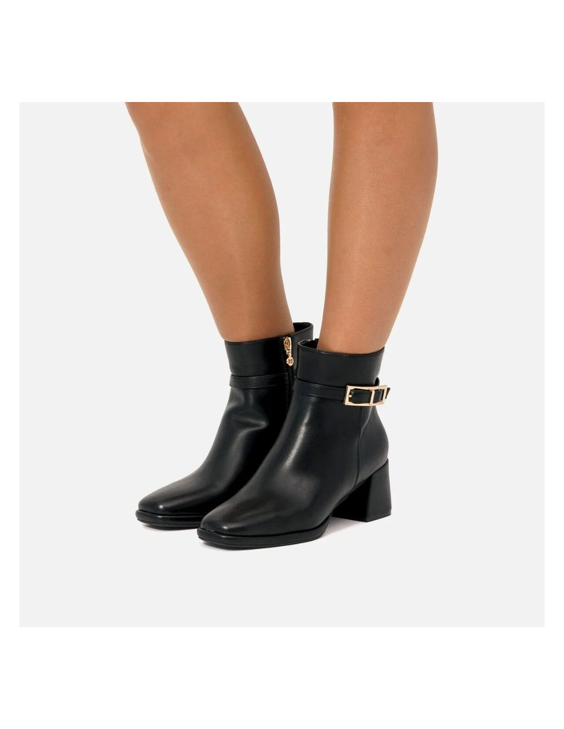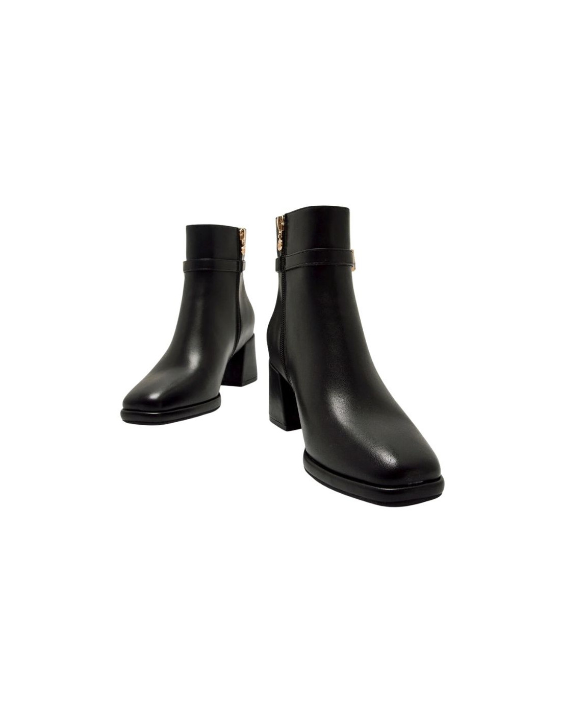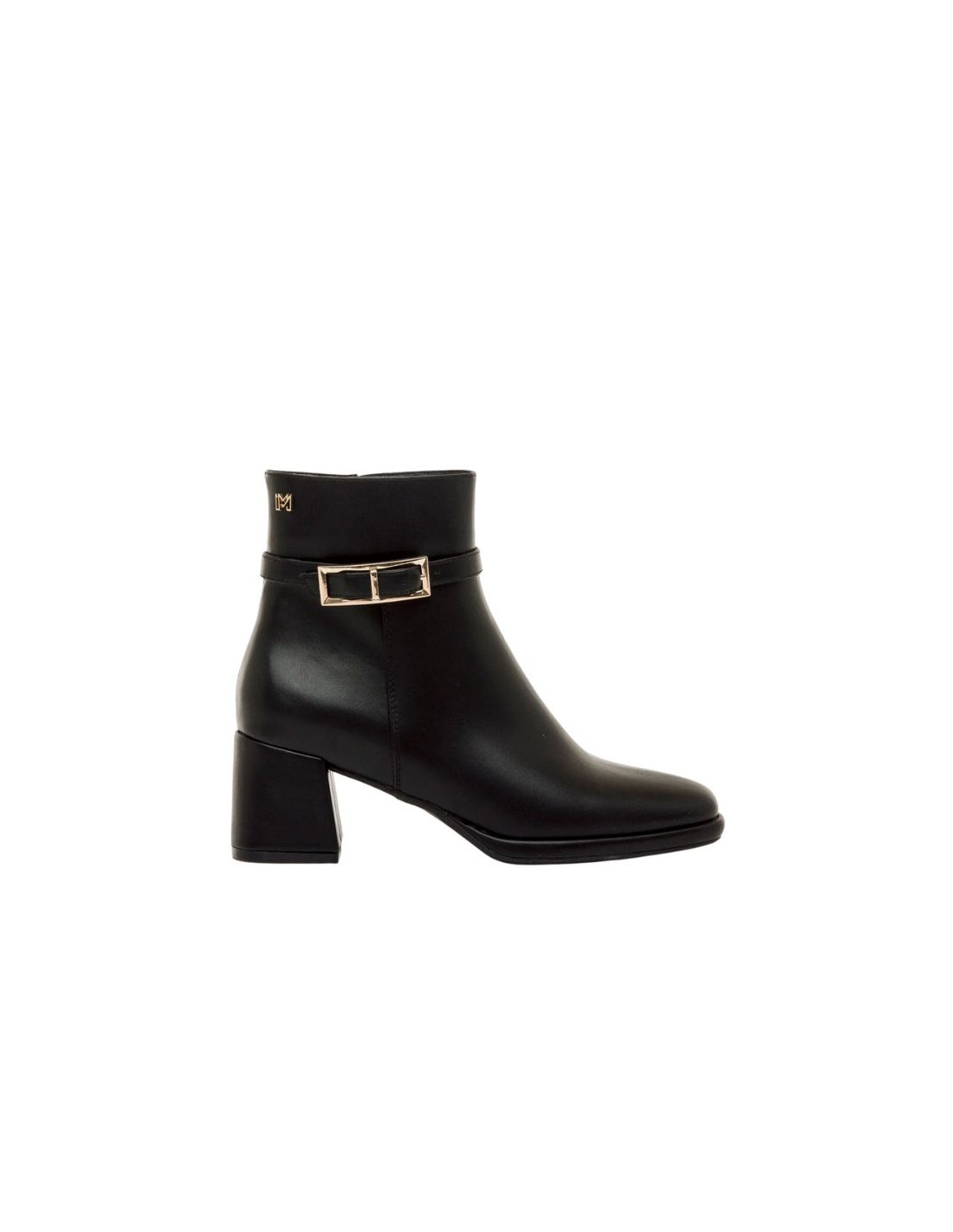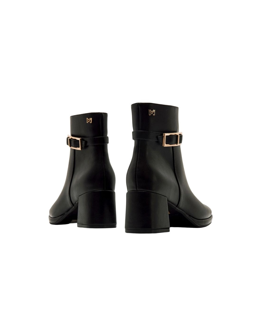 Botines negros para mujer de la marca Mariamare, modelo Nerola. Su acabado liso se complementa con una fina tira decorativa con hebilla dorada metálica en el tobillo, añadiendo un toque distintivo. El tacón ancho proporciona estabilidad y comodidad. Cuentan con cierre lateral de cremallera para un calce fácil