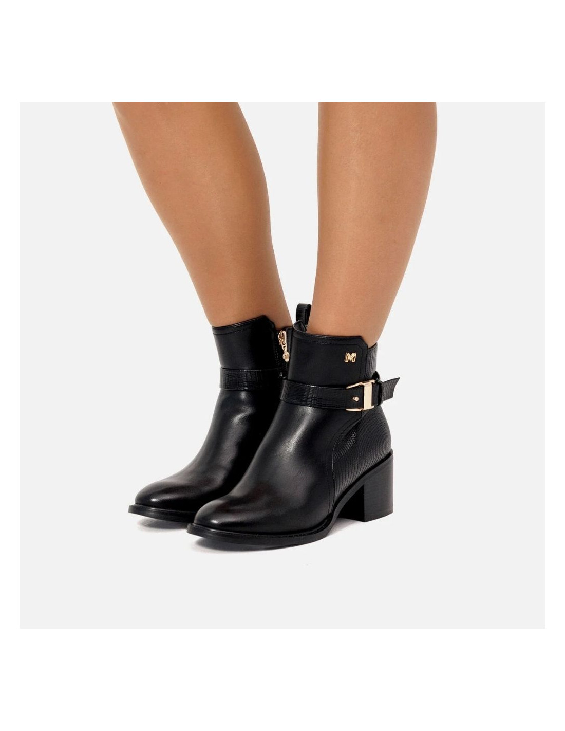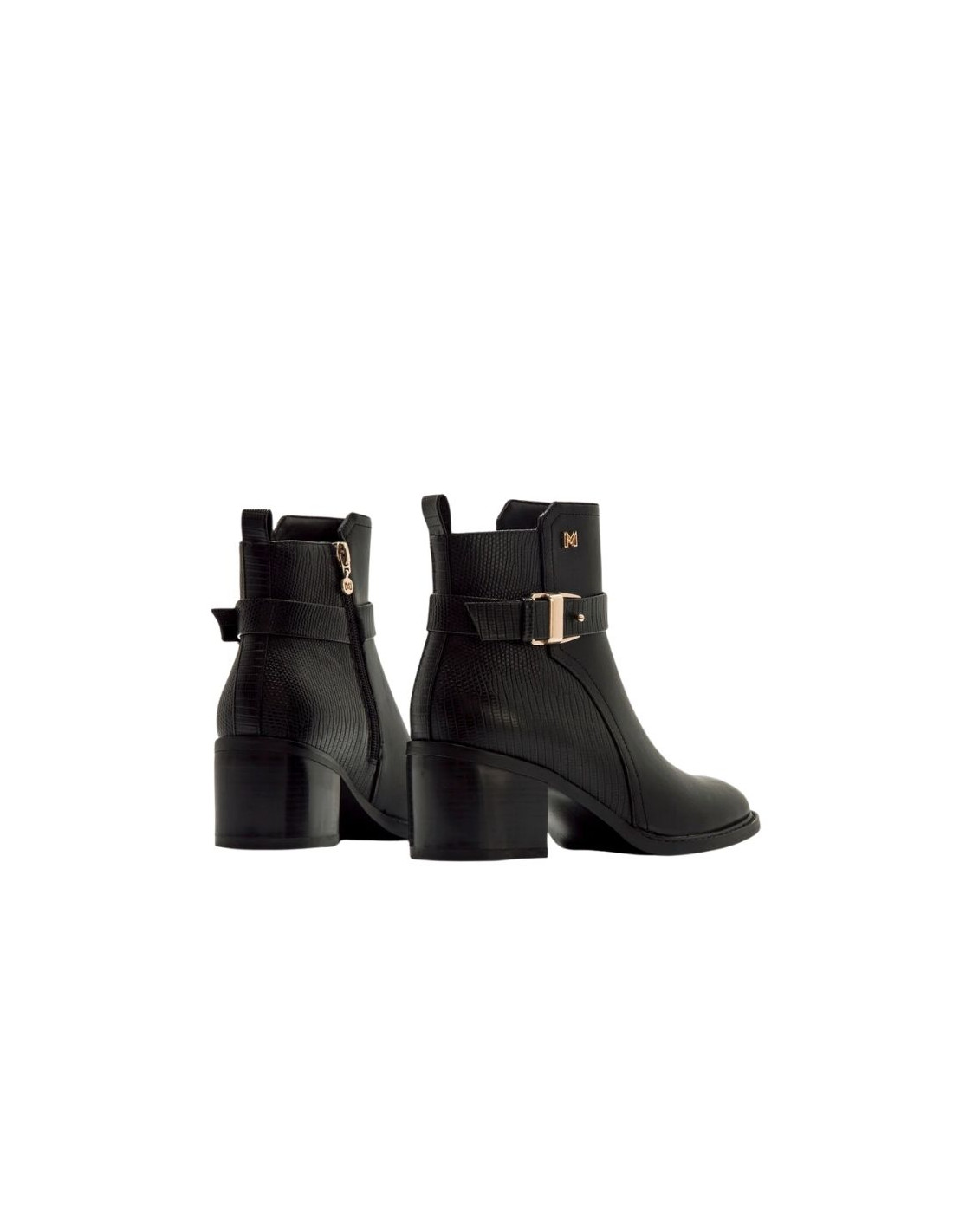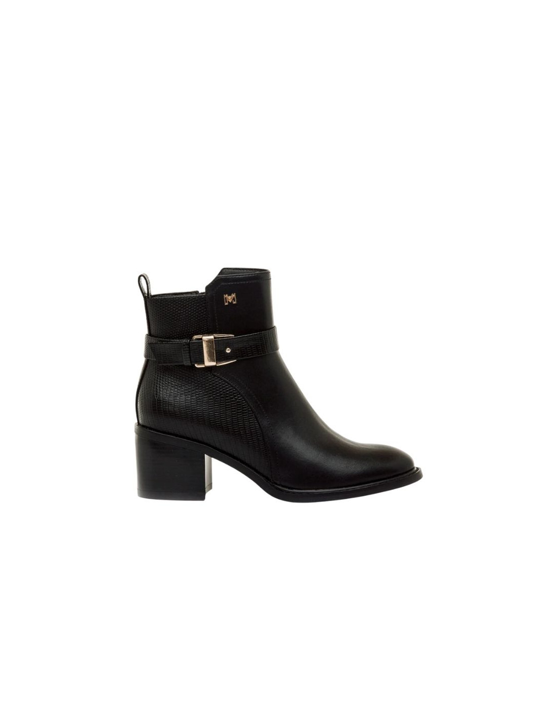 Botines para mujer de Mariamare, modelo Onore de color negro. Su diseño combina una textura lisa en la parte delantera con un acabado texturizado en el talón, aportando contraste y estilo. La hebilla dorada decorativa en el lateral y el logo metálico añaden un toque distintivo. Cuentan con un cierre de cremallera lateral para mayor comodidad. Su tacón ancho brinda estabilidad, haciéndolos ideales para el día a día o para complementar looks más formales.