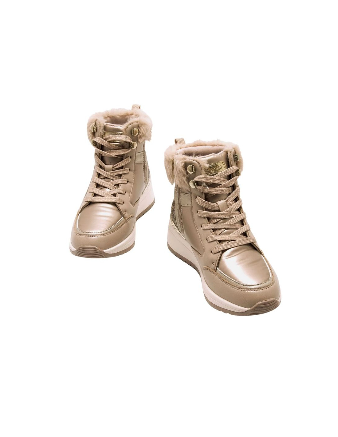 Botines deportivos de color beige para mujer, modelo Salerno de la marca Mariamare. Su diseño combina diferentes texturas, incluyendo un acabado con efecto metalizado y acolchado, y detalles animal print de serpiente en el talón. El cuello con forro de pelo sintético añade calidez y un toque acogedor. Cuentan con cierre de cordones y cremallera lateral para un ajuste fácil y seguro. La suela de plataforma ligera proporciona comodidad y amortiguación