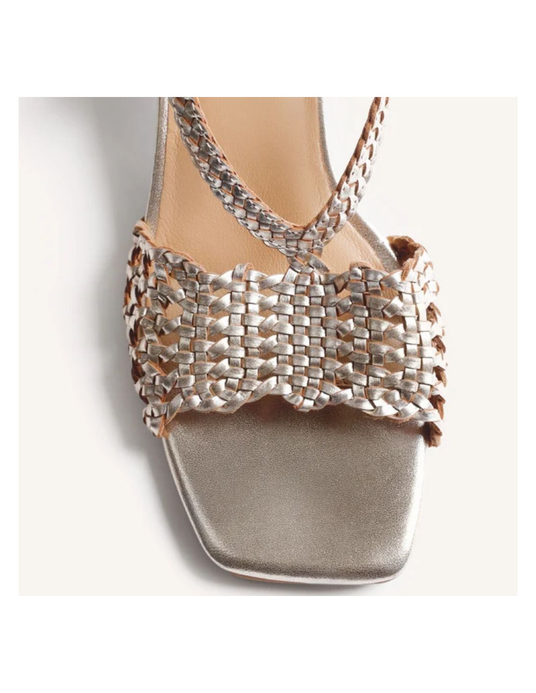 Sandalias de piel trenzada a mano con acabado metalizado. Tacón tipo bloque. Cuentan con planta acolchada y cierres ajustables en el tobillo. Altura tacón: 4,5 cm.
