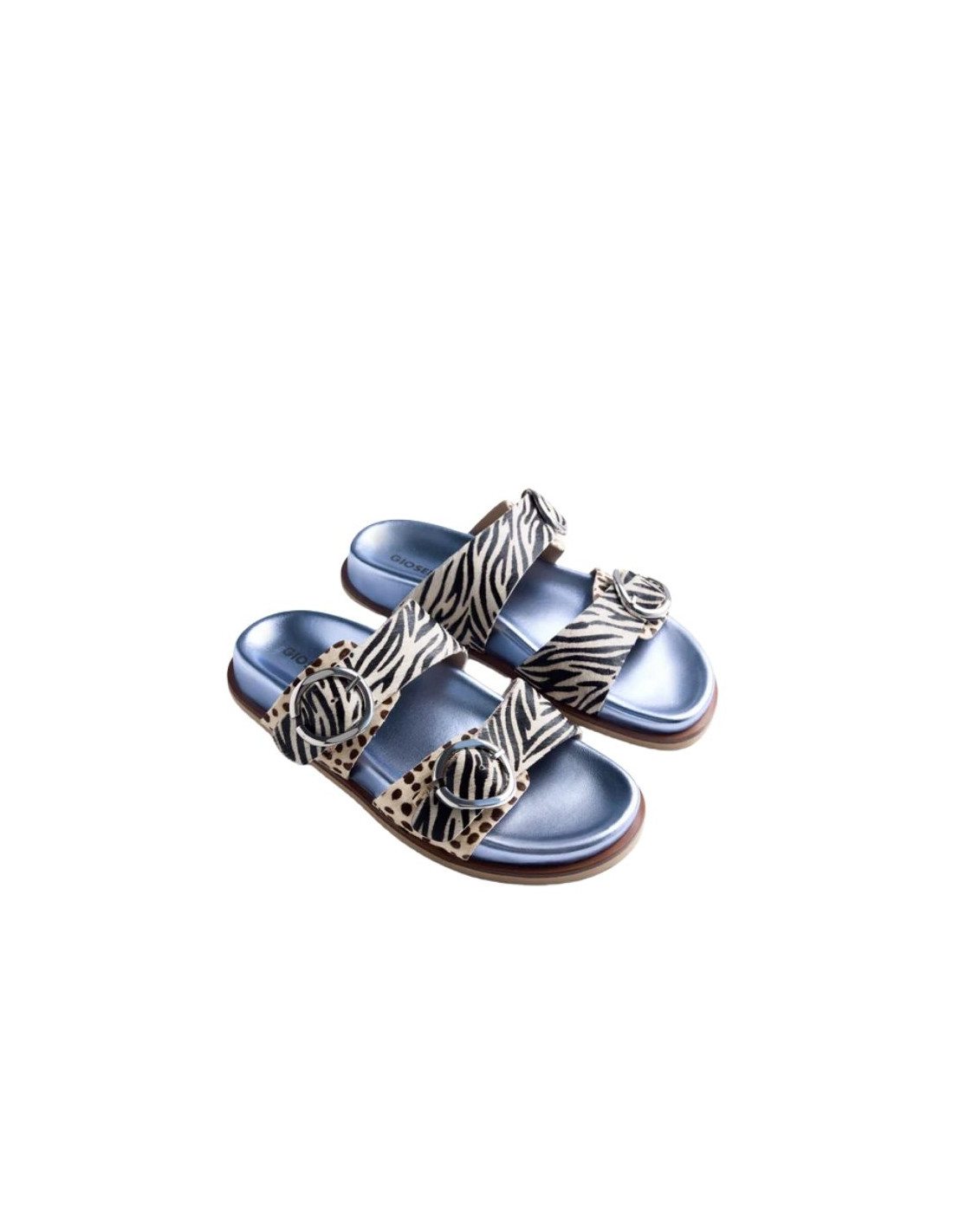 Sandalias de piel tipo pelo con estampado animal y hebillas. Cuentan con planta tipo bio forrada en piel metalizada, con diseño ergonómico para repartir el peso de manera equilibrada.