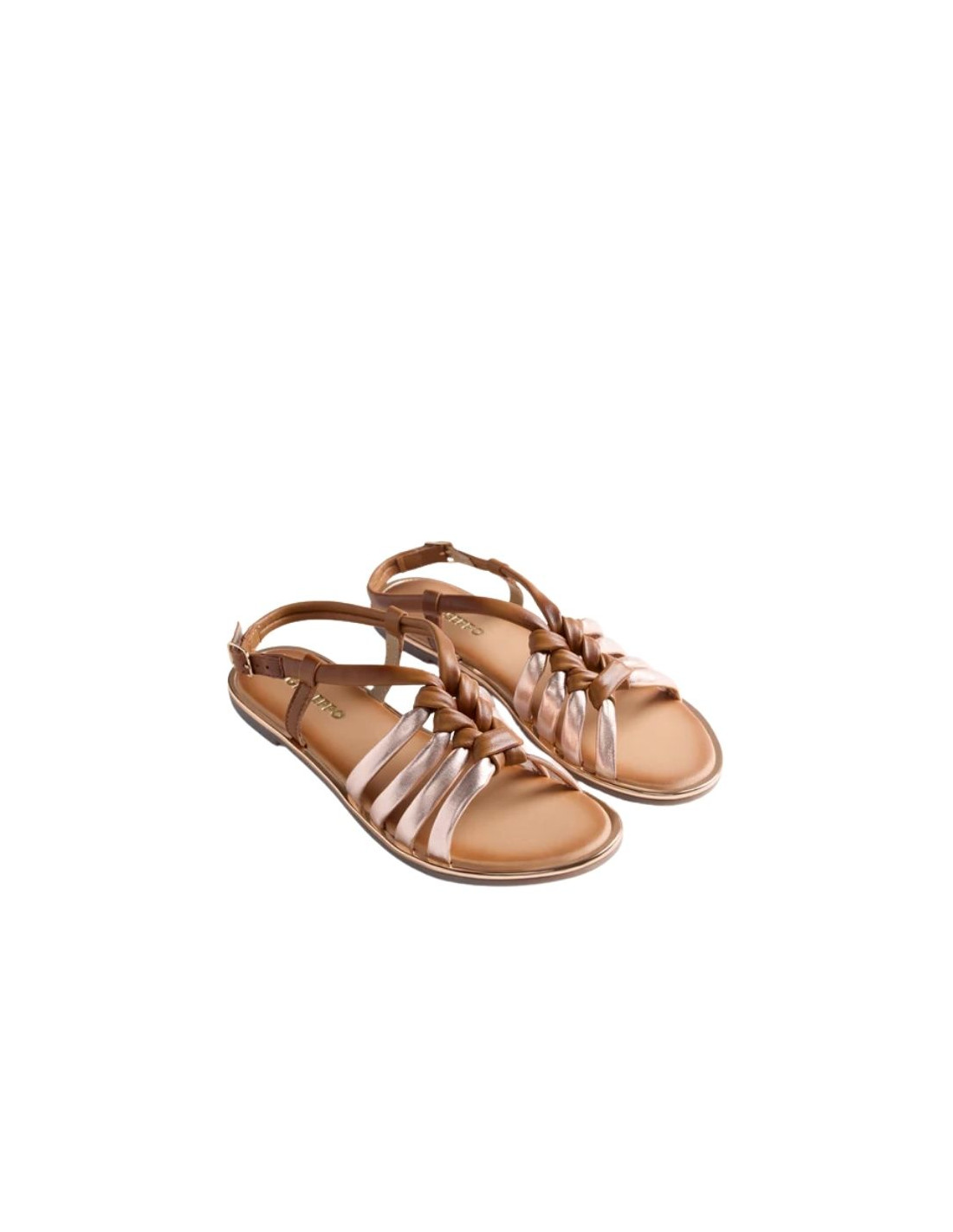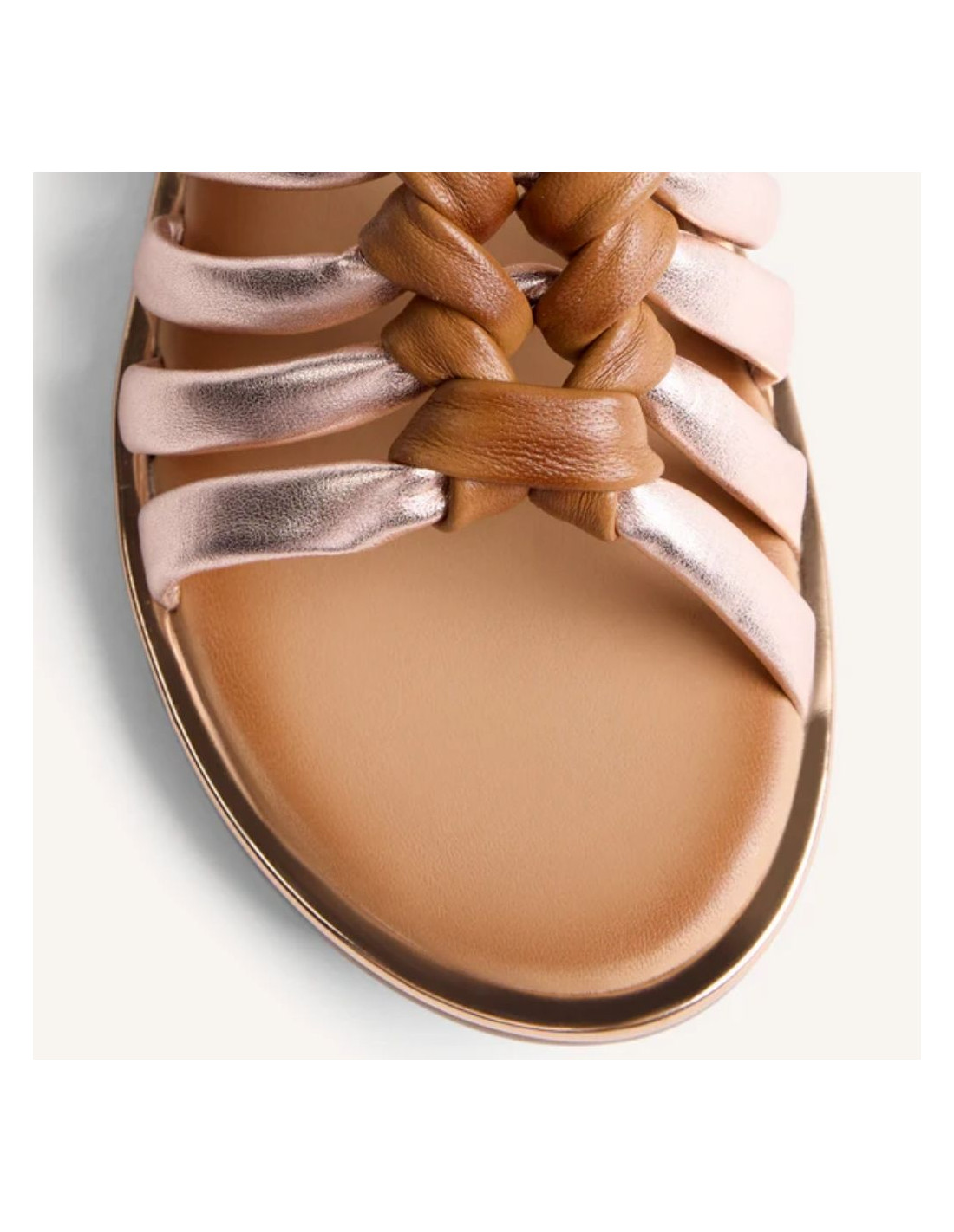 Sandalias planas de piel con acentos metalizados y detalle de nudos. Cerco metalizado. Cuentan con planta acolchada y cierres ajustables en el tobillo.