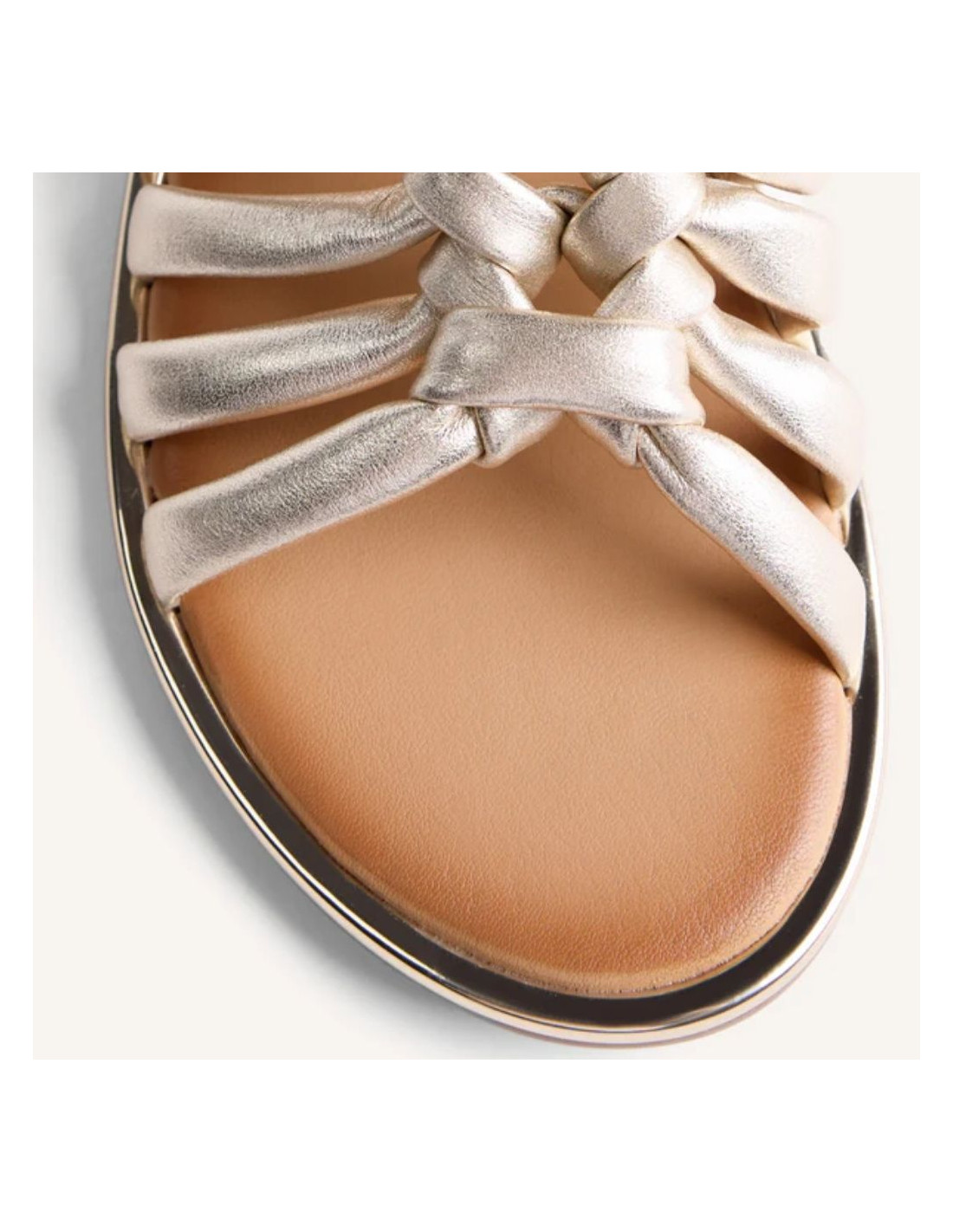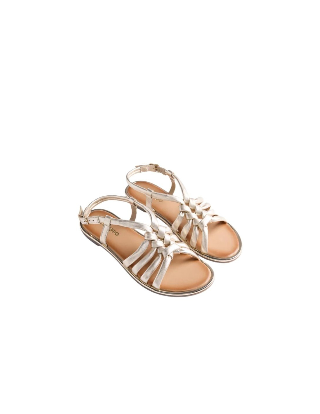 Sandalias planas de piel con acentos metalizados y detalle de nudos. Cerco metalizado. Cuentan con planta acolchada y cierres ajustables en el tobillo.