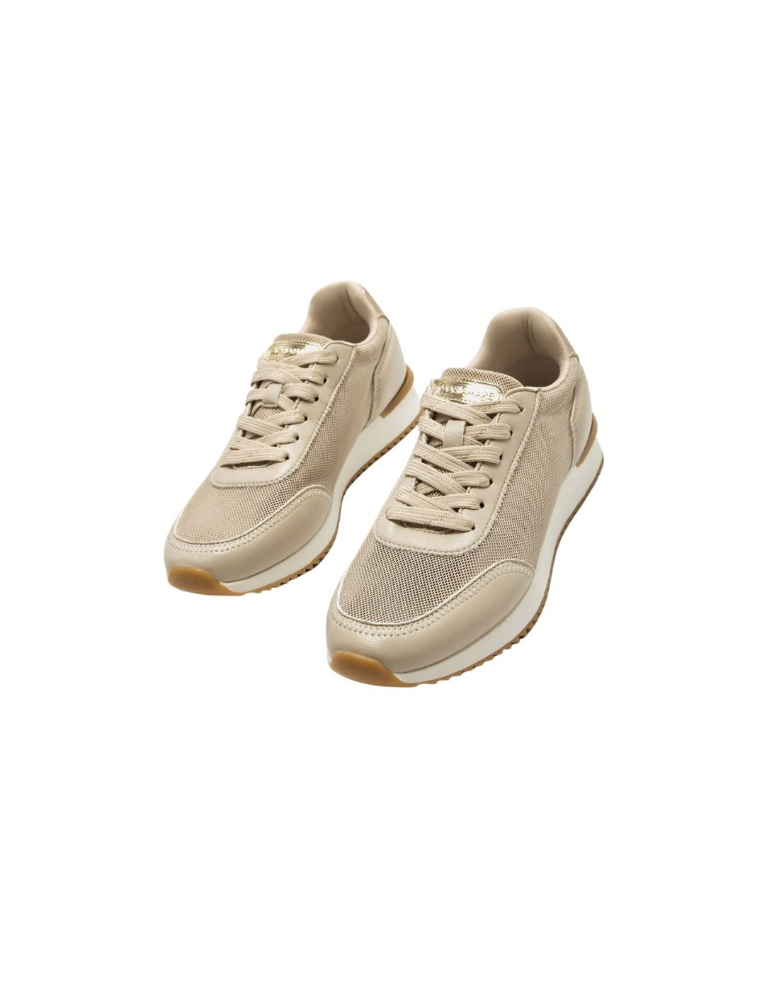 Zapatillas de color beige para mujer, modelo Livana de Mariamare estilo deportivo. Este diseño se distingue por su parte superior en malla combinada con piezas lisas y detalles metalizados en dorado, como el logo en la lengüeta y el talón. La mezcla de texturas aporta ligereza visual y un toque actual sin perder su carácter versátil. El cierre con cordones garantiza sujeción, mientras que la suela dentada mejora la comodidad. Equipadas con plantillas con tecnología Starfit, que garantizan confort en cada paso. Con certificado VEGANO sellado por INESCOP, el cual garantiza que la naturaleza química principal del material no se corresponde con fibras de origen animal.