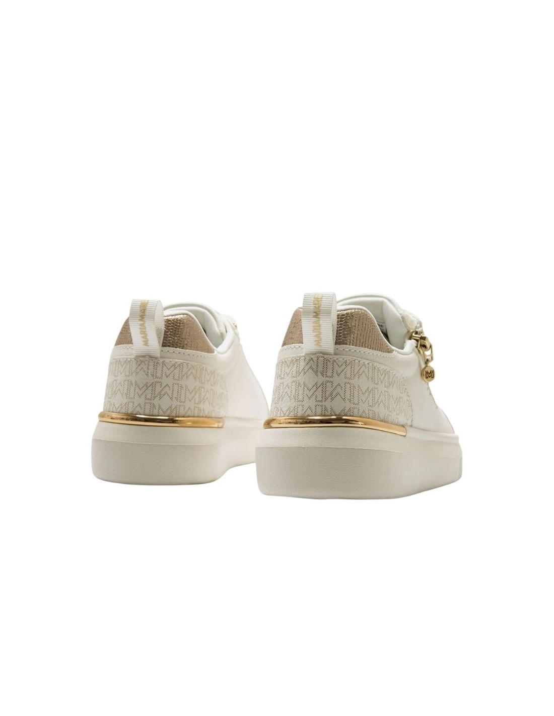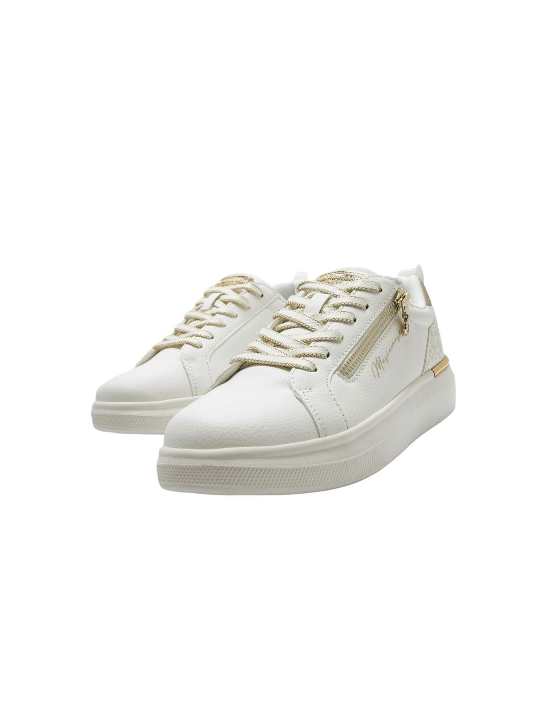Zapatillas casual de color blanco para mujer, modelo Varese de Mariamare con un estilo urbano y detalles metalizados. El talón incorpora el logotipo en tono dorado, a juego con la cremallera lateral funcional y los cordones con borde brillante. La suela blanca aporta altura y equilibrio al diseño, manteniendo un perfil limpio y actual. Equipadas con plantillas con tecnología Starfit, que mejoran la comodidad en cada paso. Con certificado VEGANO sellado por INESCOP, el cual garantiza que la naturaleza química principal del material no se corresponde con fibras de origen animal.