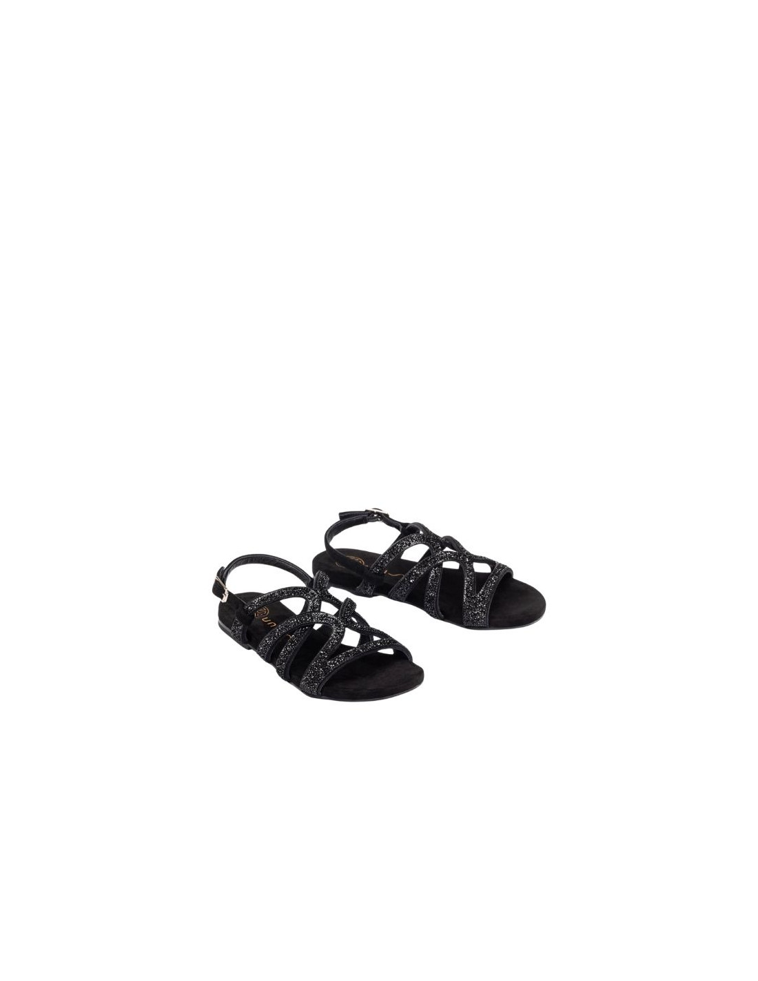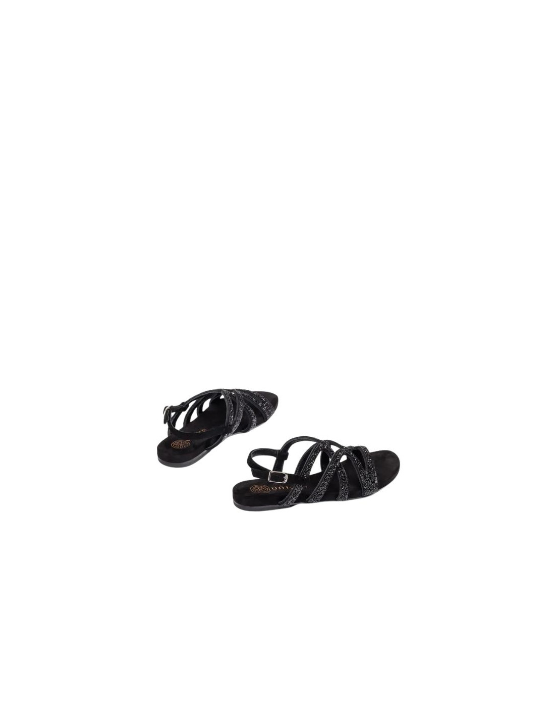 Sandalia plana de punta redonda fabricada en ante. Tiras con detalles de cristales brillantes. Ajustable con hebilla metálica. Suela de goma ligera, antideslizante y muy flexible. No vas a querer ponerte otra sandalia.